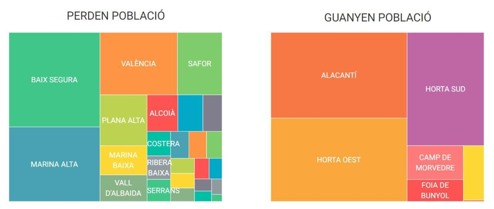 Mapes d'arbre de les comarques que han perdut i han guanyat més població en l'última dècada / Manel Castañeda
