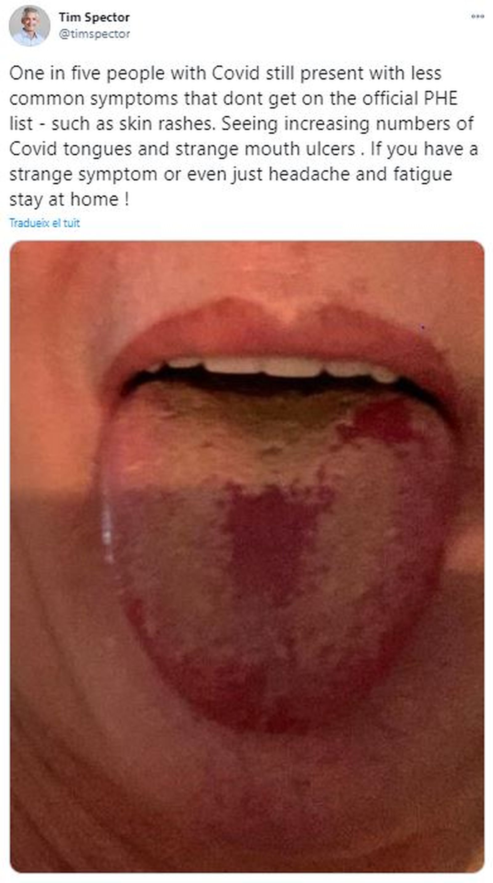 Les erupcions cutànies, les úlceres bucals i una nova infecció, anomenada “llengua Covid”, poden ser manifestacions preliminars d'un contagi de coronavirus. L'alerta l'ha donada l'epidemiòleg britànic Tim Spector, des del seu compte de Twitter, advertint que una de cada cinc persones contagiades per la Covid-19 presenta símptomes poc freqüents, com erupcions cutànies o úlceres bucals. “Si teniu un símptoma estrany o fins i tot només us fatigueu, quedeu-vos a casa!”, recomana l'investigador.