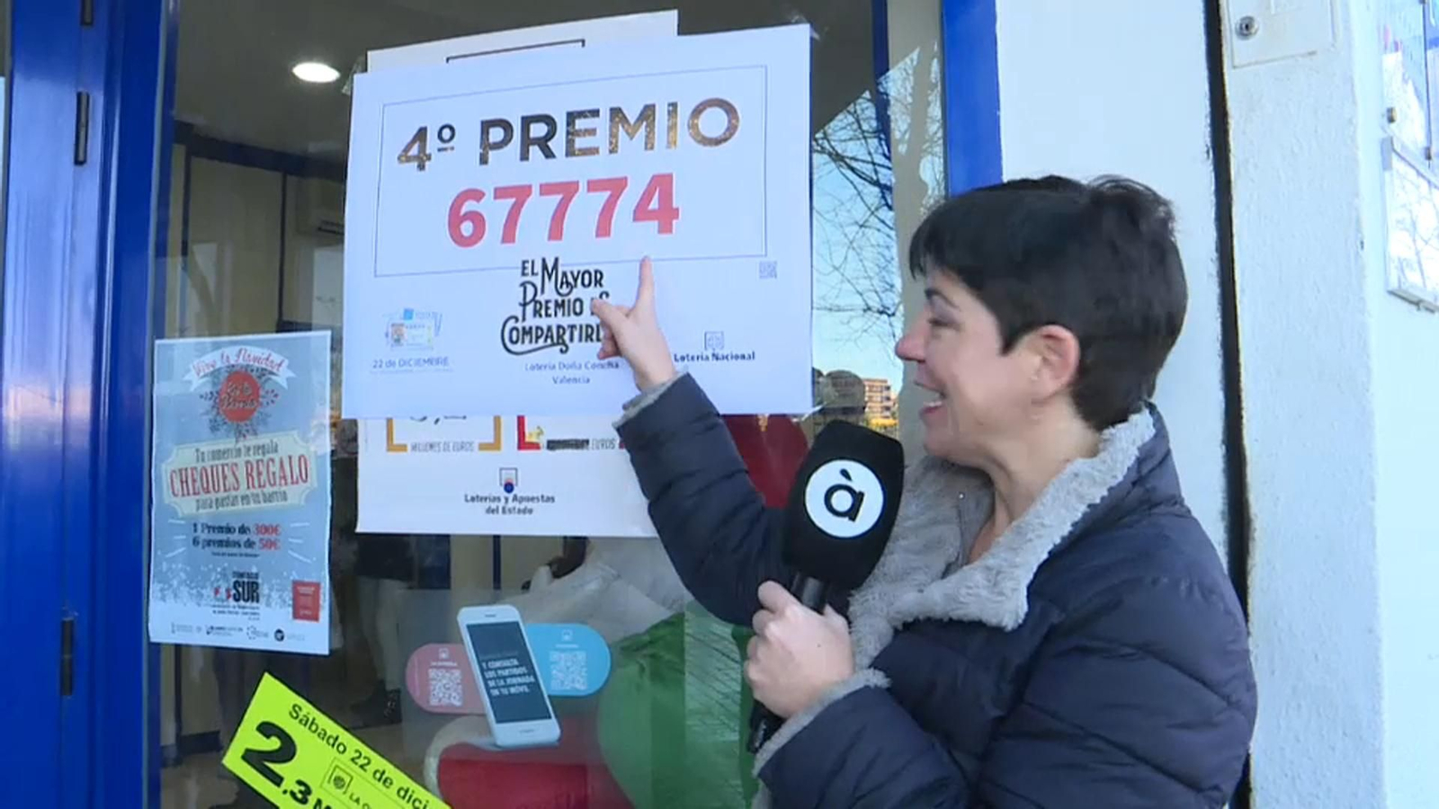 Un cinqué íntegre deixa 10,2 milions al CampelloEl número 63025 ha sigut premiat amb un dels cinquens premis, afavorit amb 60.000 euros a la sèrie i 6.000 al dècim. S'ha venut íntegrament al Campello, a l'Alacantí, a l'administració de loteria del carrer Sant Bertomeu, que hi ha prop de la platja. Com ha venut 170 sèries del número, ha repartit 10,2 milions d'euros. El Campello, aquest dissabteUn altre dels quints, el 20202, premiat amb 60.000 euros la sèrie, s'ha repartit en una administració de la ciutat d'Alacant i un altra de Madrid. A Alacant s'han repartit dos sèries del número, la qual cosa suposa un premi de 120.000 euros.El número 18596 ha quedat afavorit amb el seté dels huit quints premis de la loteria de Nadal. Dues administracions d’Alacant han venut bitllets, dels carrers Alfons X el Savi i Mestre Lluís Torregrossa i han repartit entre el veïnat 4 milions d'euros.Un cinqué rega amb 5,4 milions València i Foios El primer número guardonat del sorteig és el 47862, un cinqué premi dotat amb 60.000 euros a la sèrie i que s'ha escampat també la Comunitat Valenciana. Entre altres localitzacions espanyoles, s'ha venut a l'administració del centre comercial Nuevo Centro de València, on ha deixat 900.000 milions d'euros, i a Foios, l'Horta Nord. Ací han caigut altres 4,5 milions, dels quals 4 han anat a parar a l'associació Filles de Maria, que havia venut vora 400 paperetes. En total, el 47862, guardonat amb 60.000 euros a la sèrie, ha premiat la Comunitat Valenciana amb 5,4 milions d'euros. Administració de loteria de Foios, aquest dissabte2 milions al camí de PicanyaEl número 67774 ha guanyat un quart premi, afavorit amb 200.000 euros a la sèrie. Ha regat el territori valencià amb 3,2 milions d'euros i s'ha repartit entre les localitats de València, Xirivella, la Canyada, Moraira, Santa Pola, la Romana i Borriana. A la ciutat de València ha deixat 2 milions d'euros gràcies als cent dècims que ha venut l'administració Doña Concha, que està al camí de Picanya. Administració Doña Concha, que està al camí de Picanya1,8 milions a MislataUn altre cinqué premi, el 29031, ha regat 35 províncies espanyoles i ha deixat una pluja de diners en diversos racons del territori valencià, Guardonat amb 60.000 euros a la sèrie, s'ha venut a Xirivella, Elx, Alcoi, Castelló, Mislata, Quartell, València, Alaquàs i Alcàsser. En concret, l'administració de Mislata n'ha venut 30 sèries, cosa que suposa repartir 1,8 milions d'euros. Una perruqueria i una associació de jubilats de Tarragona s'han repartit 1,2 milions d'aquest cinqué premi. A Xirivella se n'han venut tres dècims, mentre que a les administracions d'Acoi, Elx, Castelló, Alaquàs, Alcàsser, Quartell i València se n'ha venut un. Una de les agraciades a Mislata amb el bitllet guanyador del segon premi