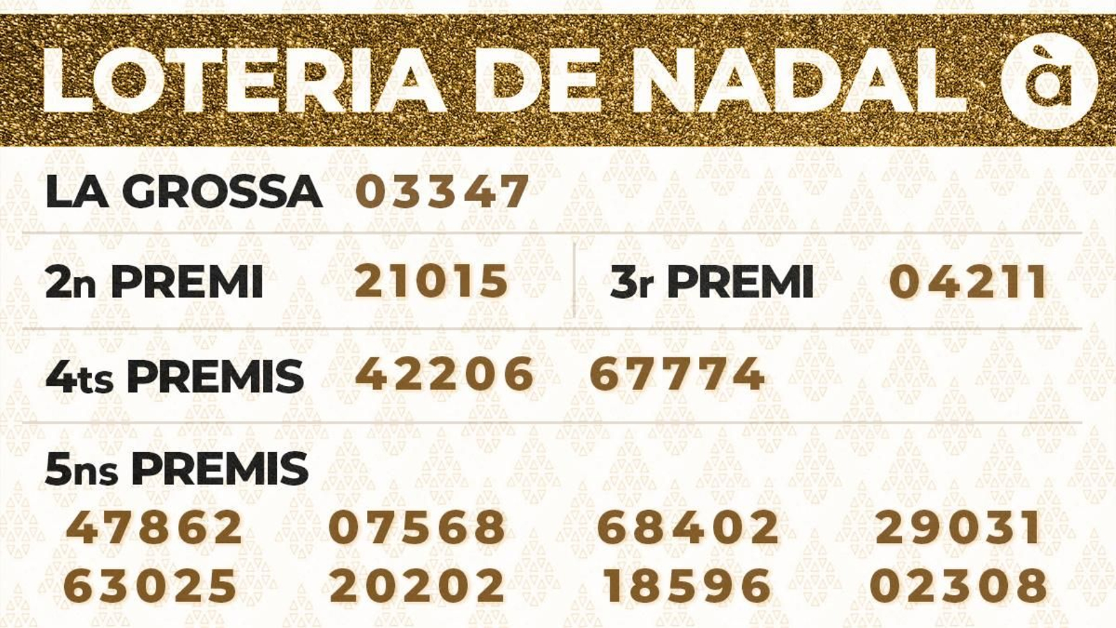El sorteig extraordinari de la Loteria de Nadal ha deixat una pluja de vora 72,77 milions d'euros per tota la Comunitat Valenciana. D'aquesta quantitat, 12,4 corresponen a la Grossa, que ha caigut en el número 3347. S'ha repartit entre diverses poblacions, incloses 13 valencianes.