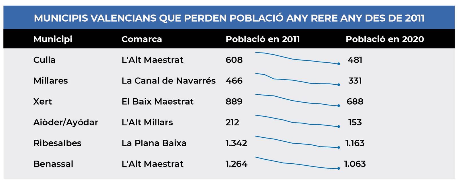 A la província de Castelló corresponen també cinc dels sis municipis que han perdut població cada any des de 2011: Culla i Benassal (Alt Maestrat), Xert (Baix Maestrat), Aiòder (Alt Millars) i Ribesalbes (Plana Baixa). Completa la llista Millars (Canal de Navarrés), a l'interior de València.