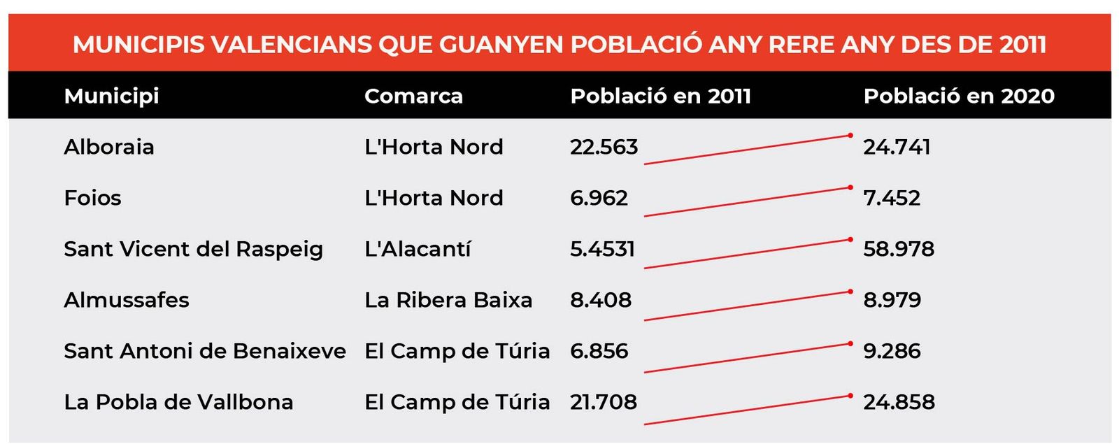 La província de València lidera el rànquing de localitats que més han crescut proporcionalment en els últims deu anys; Alboraia i Foios a l'Horta; la Pobla de Vallbona i Sant Antoni de Benaixeve al Camp de Túria; i Almussafes a la Ribera Baixa. A la llista també hi ha Sant Vicent del Raspeig (Alacantí), que ha incorporat més de 4.500 persones en els últims deu anys, per influència de l'àrea metropolitana d'Alacant, i frega ja els 60.000 habitants.