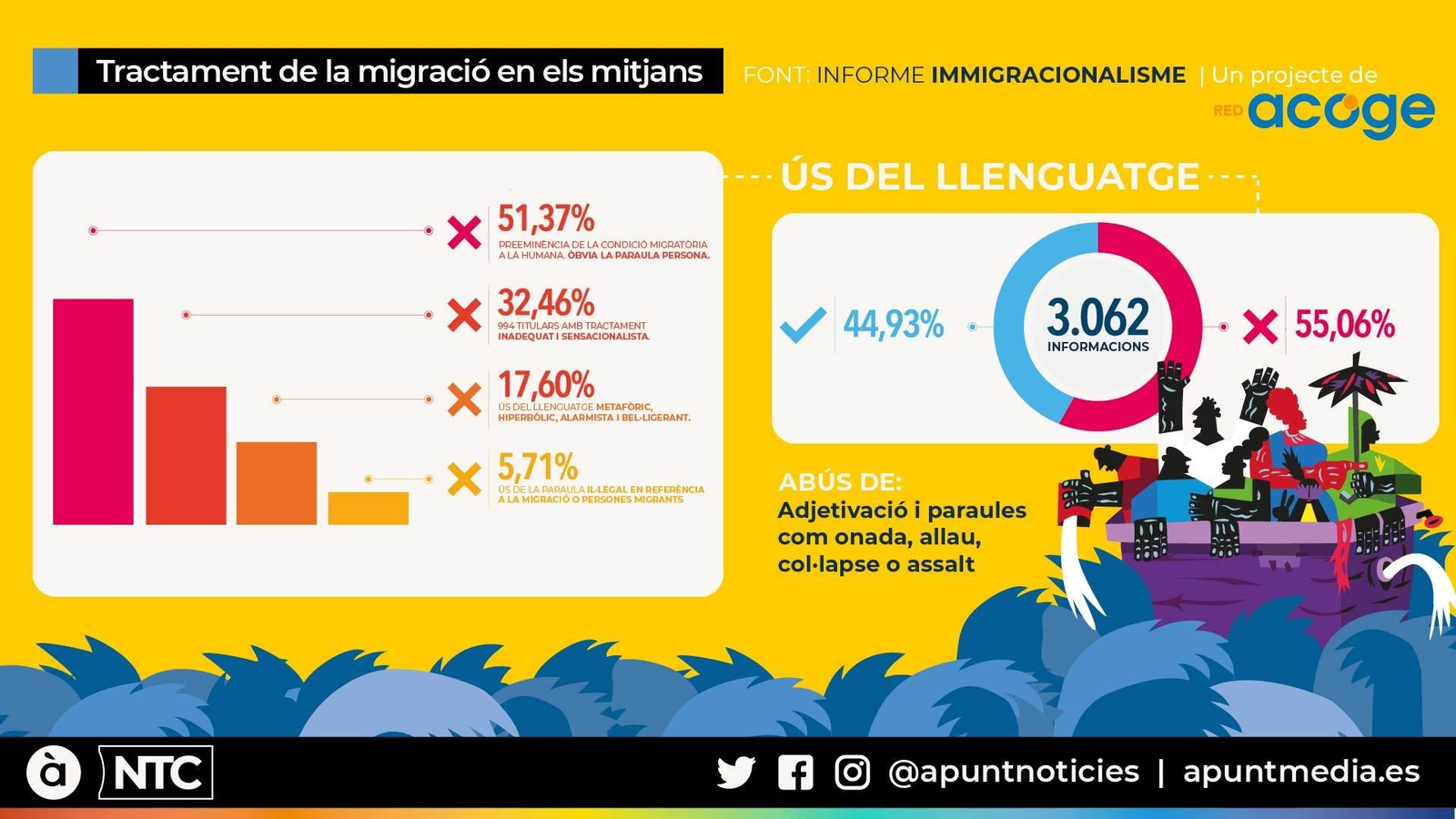 Més de la meitat de les notícies sobre migrants ometen la paraula persona. És una de les principals conclusions de l'informe anual del projecte Immigracionalisme: avançant en el discurs positiu de la federació d'ONG especialitzades en la inclusió social de les persones migrants i asilades a Espanya, Xarxa Acull. Se n’afigen altres com l’excés d’adjectivació, la manca de migrants com a font o el reforçament d’estereotips.