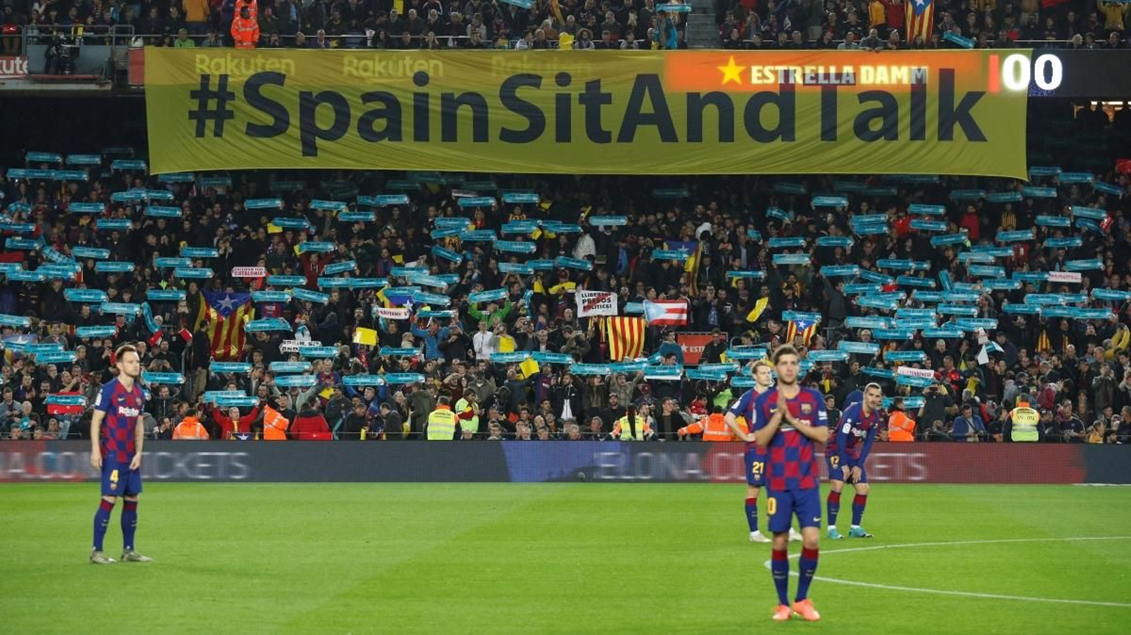Sota el lema “Spain, Sit and Talk”, s’han concentrat a l’estadi en les hores prèvies al partit de Lliga en què s’enfronten, a les 20:00 hores, el FC Barcelona i el Reial Madrid, i reclamen "drets, llibertat i autodeterminació".