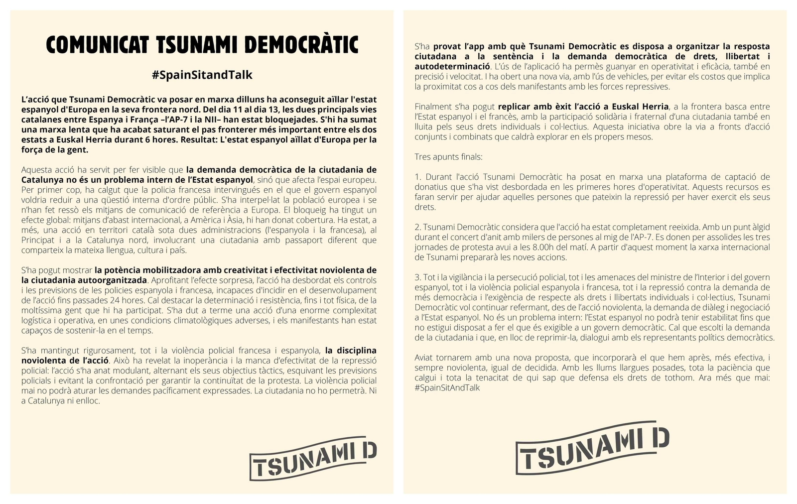 En un comunicat, que els mostrem ací, els convocants dels talls apunten que "aquesta acció ha servit per a fer visible que la demanda democràtica de la ciutadania de Catalunya" afecta tot Europa. Manifesten satisfacció perquè els mitjans de comunicació europeus se n'han fet ressó i el "bloqueig ha tingut un efecte global".