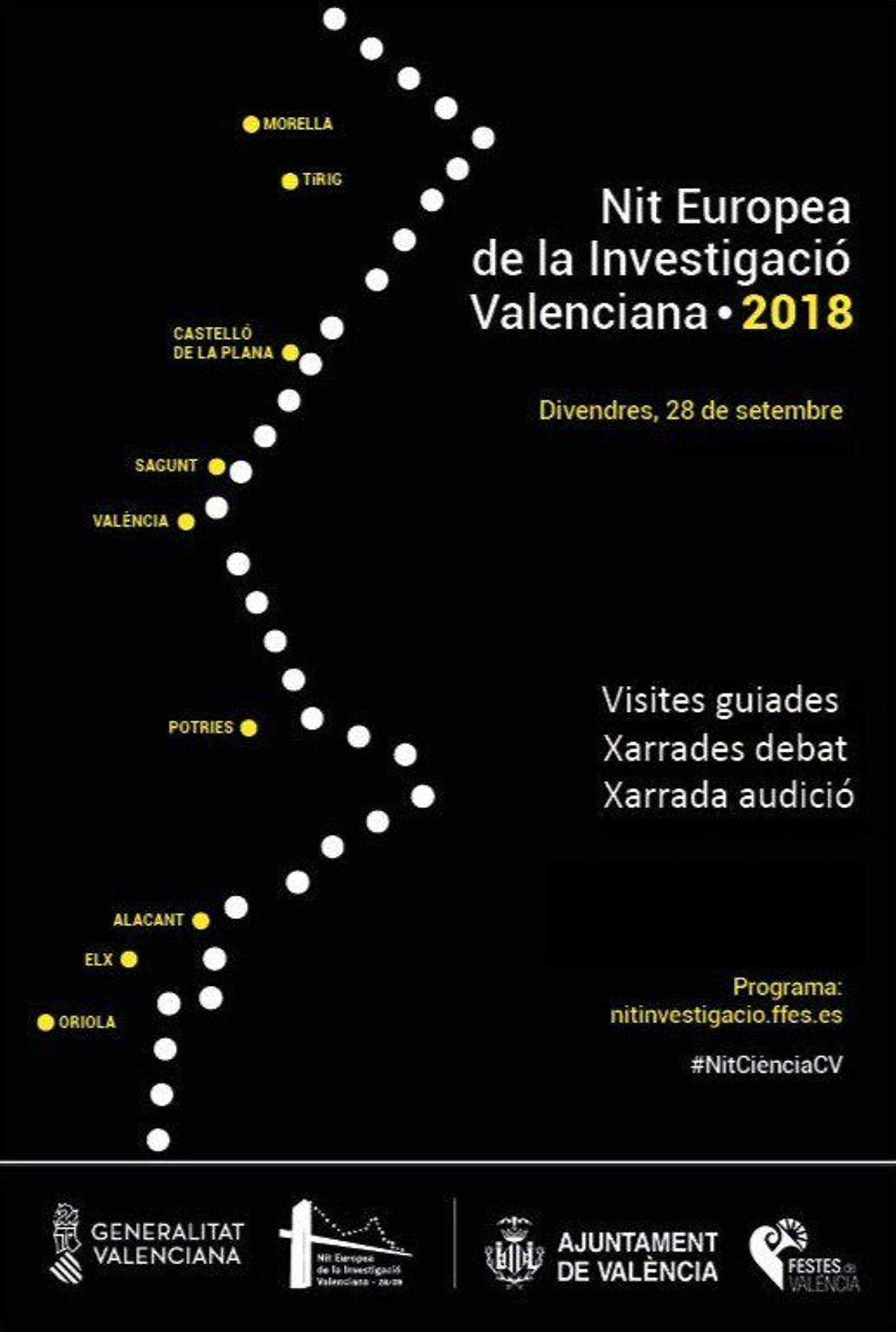 La Generalitat impulsa aquest divendres, per primera vegada, la Nit Europea de la Investigació Valenciana, durant la qual s’oferiran més de seixanta propostes científiques i culturals en una trentena d’espais. Huit municipis valencians s’han adherit a aquesta iniciativa que celebren simultàniament 300 ciutats europees: Morella, Tírig, Castelló, Potries, València, Alacant, Elx i Oriola.