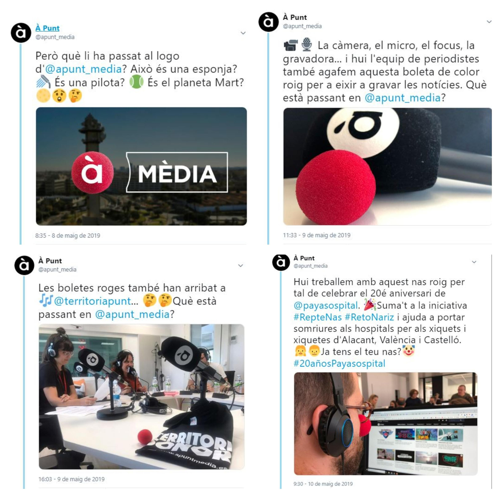 À Punt Mèdia s'ha sumat aquesta simpàtica iniciativa que dona visibilitat al gran treball que realitza cada dia l'organització. Així, davant la curiositat i, fins i tot, cert desconcert en part de l'audiència, hem anat "infiltrant" els nassos colorats en els estudis de ràdio i televisió, així com en les xarxes socials.
