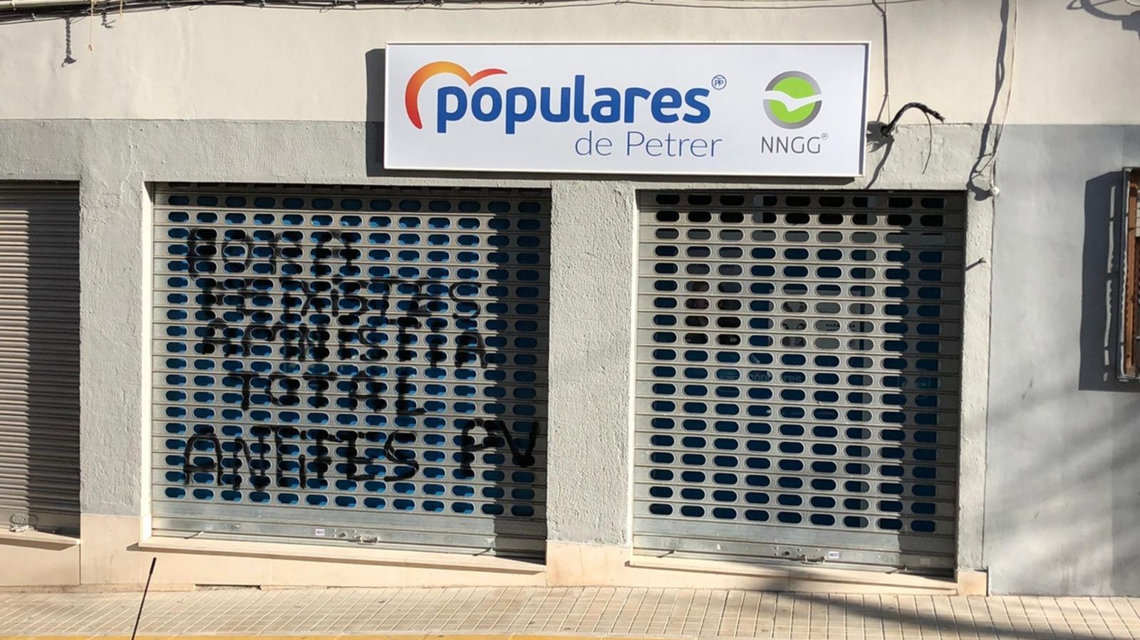 "Fora feixistes", "Amnistia total", "Antifes PV" són alguns dels missatges que s'han trobat a les portes i les façanes de les seus d'alguns partits polítics de la comarca del Vinalopó Mitjà. A Elda, Petrer i Monòver algunes de les seus del PSOE i del PP han aparegut amb aquestes pintades insultants.