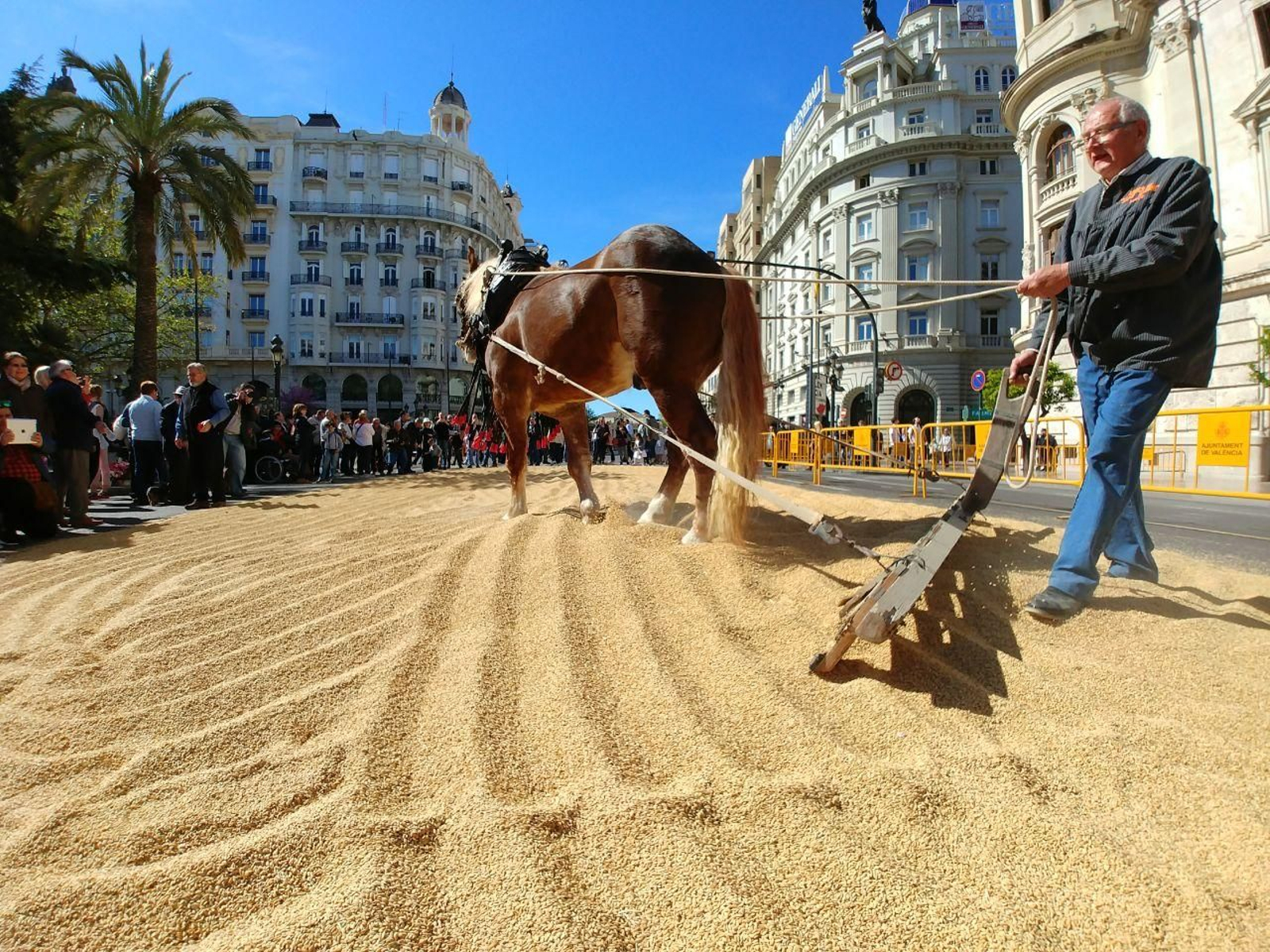 Des de les 09.00 hores, una part de la plaça s'ha convertit en un gran sequer d'arròs, on s'han secat 10.000 quilos d'arròs amb l'ajuda d'animals i ferramentes tradicionals.
