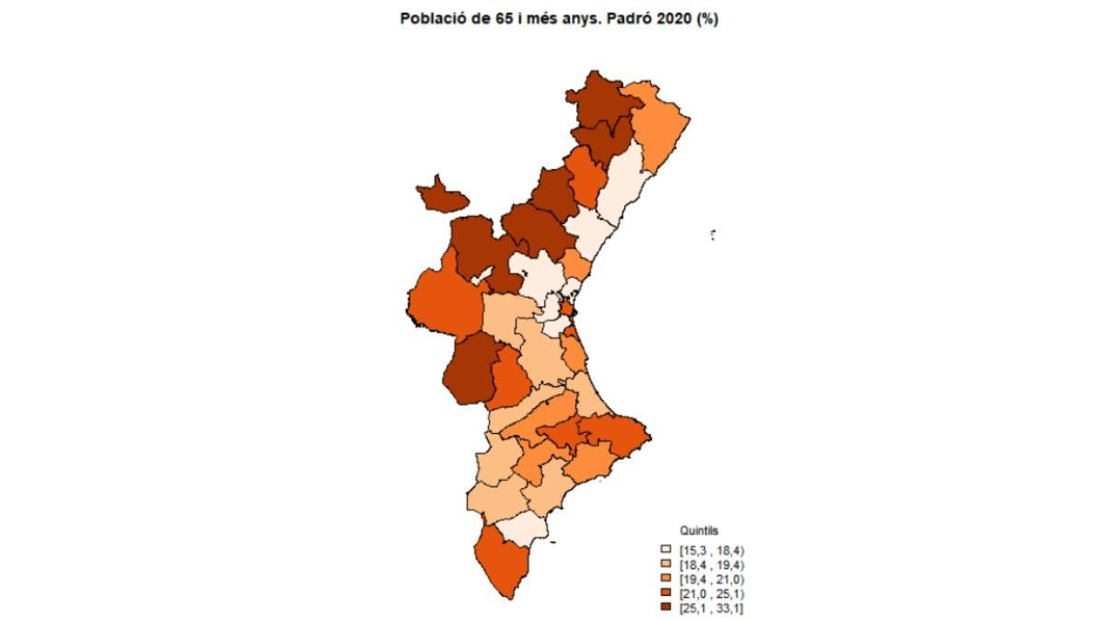 D’altra banda, els habitants tenen cada vega més edat. En 134 dels 542 municipis que hi ha a la Comunitat Valenciana, la població major de 65 anys és igual o superior al 30%. Les comarques més envellides se situen principalment a l’interior nord i central, que a més es caracteritzen per tindre poca població. Destaquen l’Alt Millars (33,11%), l’Alt Maestrat (31,17%) i el Racó d’Ademús (29,31%).