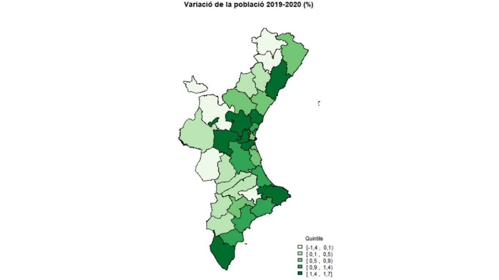 Les comarques on més ha disminuït la població, en termes relatius, són el Racó d’Ademús, els Ports, la Vall d’Aiora, l’Alt Maestrat, el Comtat i els Serrans, mentre que la Marina Alta, la Foia de Bunyol i el Camp de Túria són les que registren un major creixement.