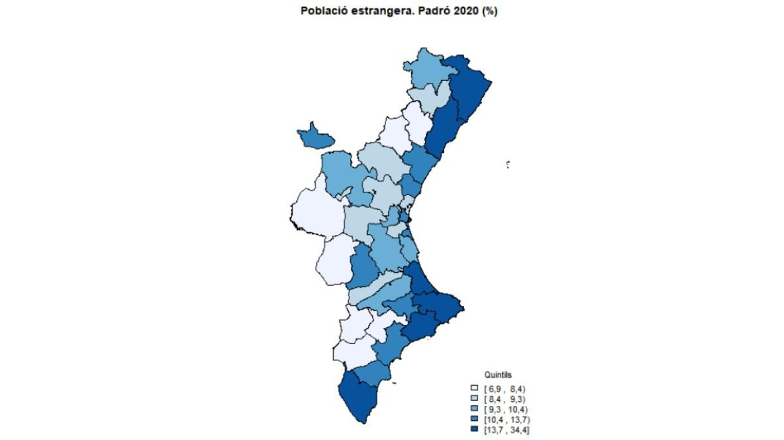 Les nacionalitats amb més població són la romanesa (103.868), la marroquina (86.466) i la britànica (81.303). Per la seua banda, les que més han crescut són la colombiana (10.691 persones més) i la marroquina (6.084 persones més). Quant a la ubicació, les persones estrangeres viuen principalment a la costa. En concret, es troben al Baix Segura (34,37%), la Marina Alta (33,99%) i la Marina Baixa (30,86%).