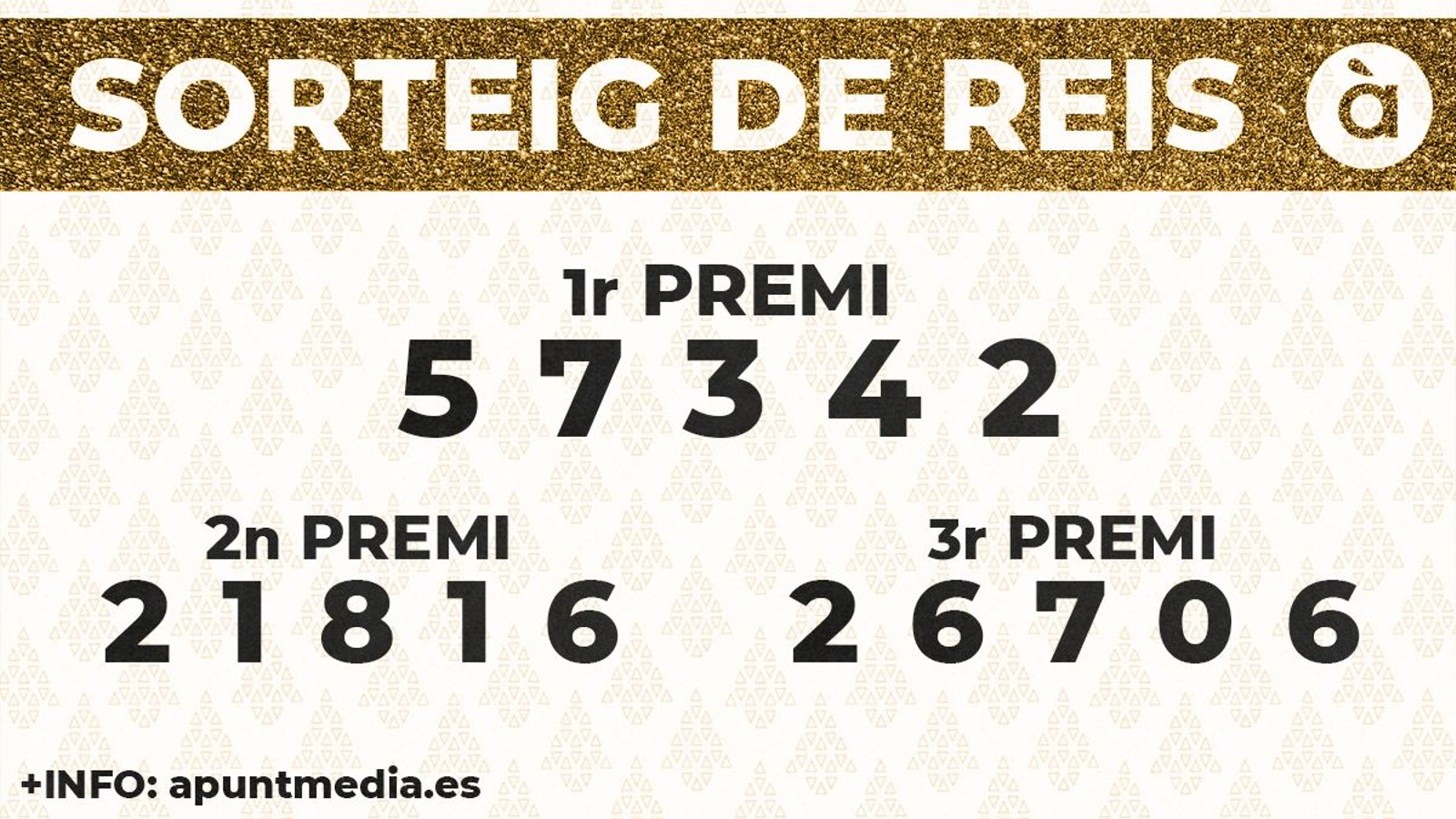 El primer premi, al qual li corresponen 200.000 euros al dècim, ha sigut per al número 57342. Ha caigut a Manises (Horta Sud) i a Simat de la Valldigna (Safor), on una papereria i botiga de regals ha venut per terminal un dècim del primer premi.