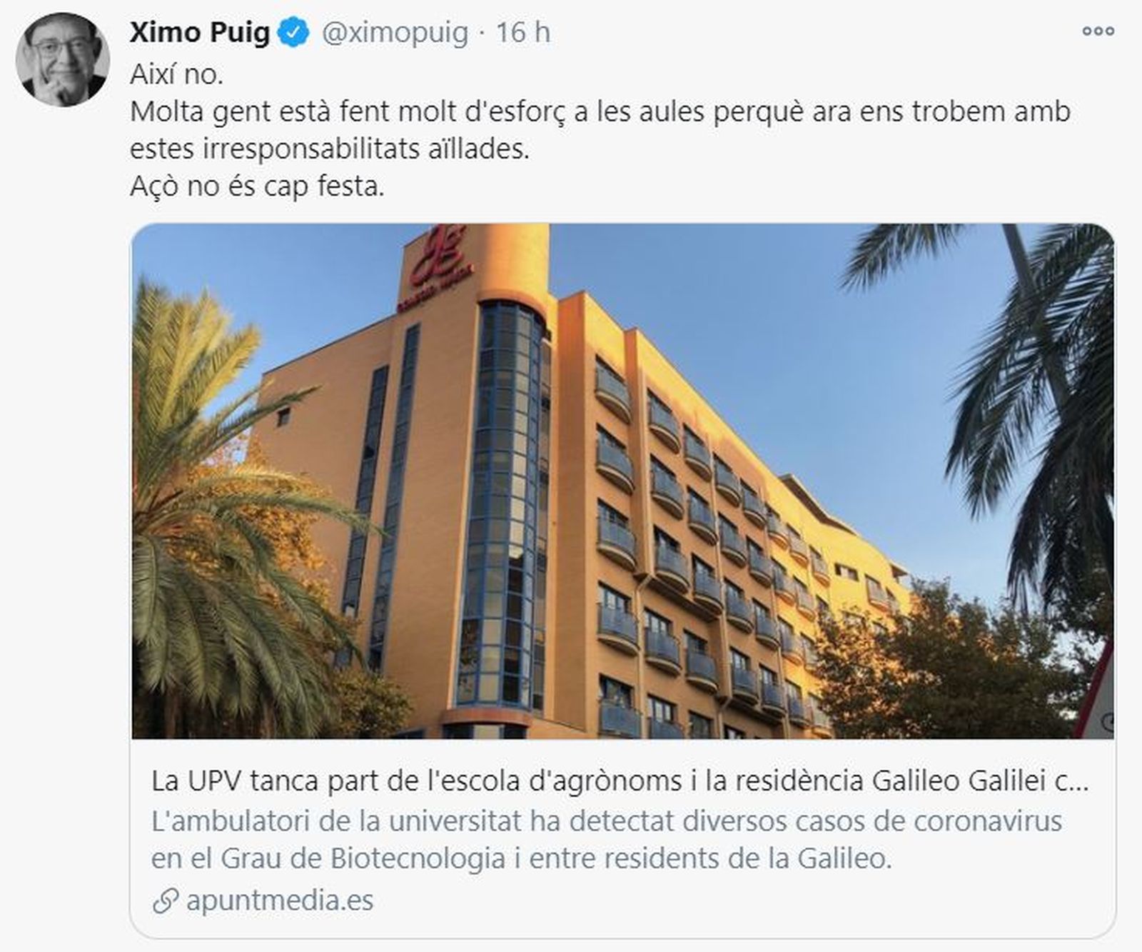 El president de la Generalitat, Ximo Puig, s'ha fet ressò de la informació publicada per À Punt per a lamentar les "irresponsabilitats aïllades" que suposen aquestes celebracions quan no es respecten les mesures preventives contra la Covid-19. "Açò no és cap festa", ha sentenciat Puig, després de recordar l'esforç que s'està fent per a assegurar una tornada a les aules amb les màximes garanties de seguretat.