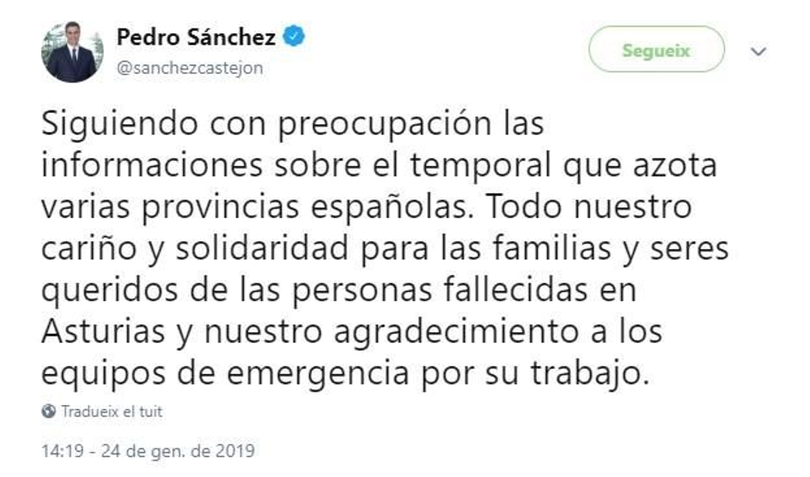 El president del govern espanyol, Pedro Sánchez, ha manifestat en les xarxes socials la seua "preocupació" davant el temporal que afecta diverses regions del nord peninsular.