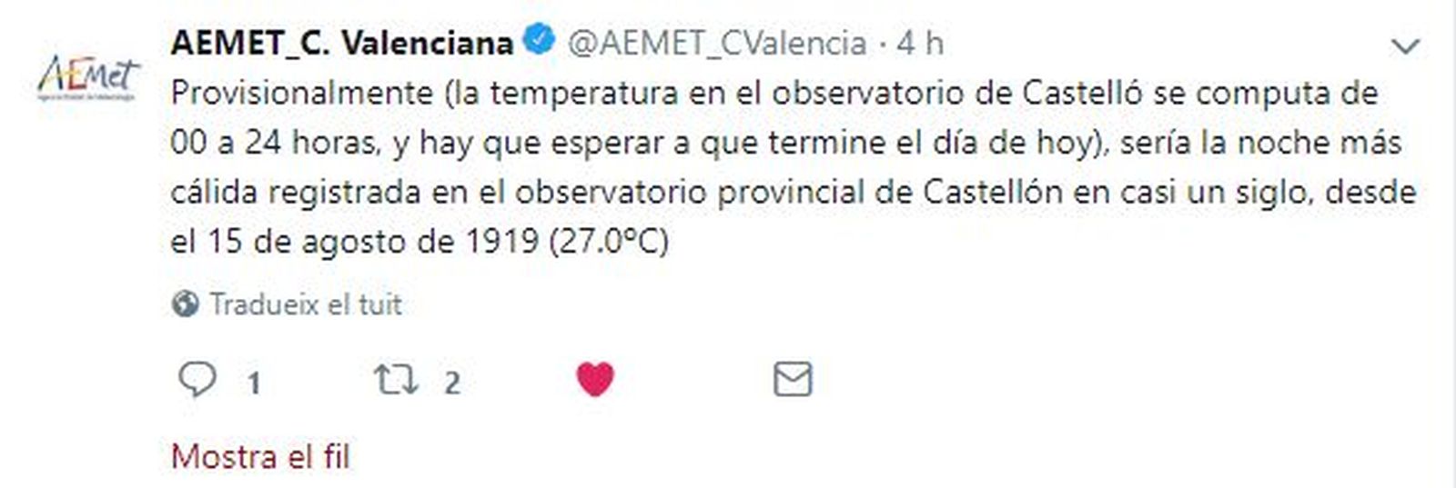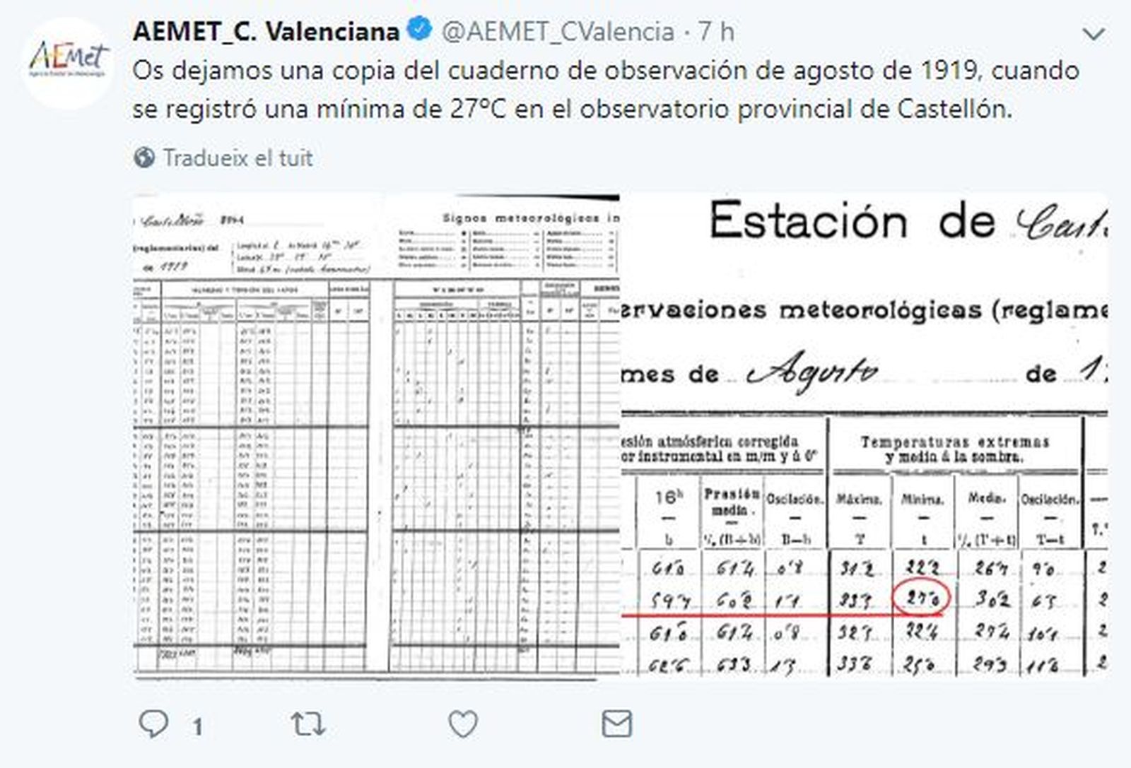 Fins a 26,5 °C han marcat aquesta passada nit els termòmetres d'Aemet a la ciutat, la xifra més alta registrada des del 15 d'agost de 1919, quan el mercuri ha arribat a 27 °C. Ara bé, la calor al centre de Castelló podria haver sigut encara més intensa, perquè aquest observatori ha canviat de localització geogràfica i en l'actualitat està menys pròxim al nucli urbà. Curiosament, l'Aemet ha publicat, també en les xarxes socials, els quaderns que daten de 1919 on quedaren registrades les temperatures de l'observatori provincial de Castelló.