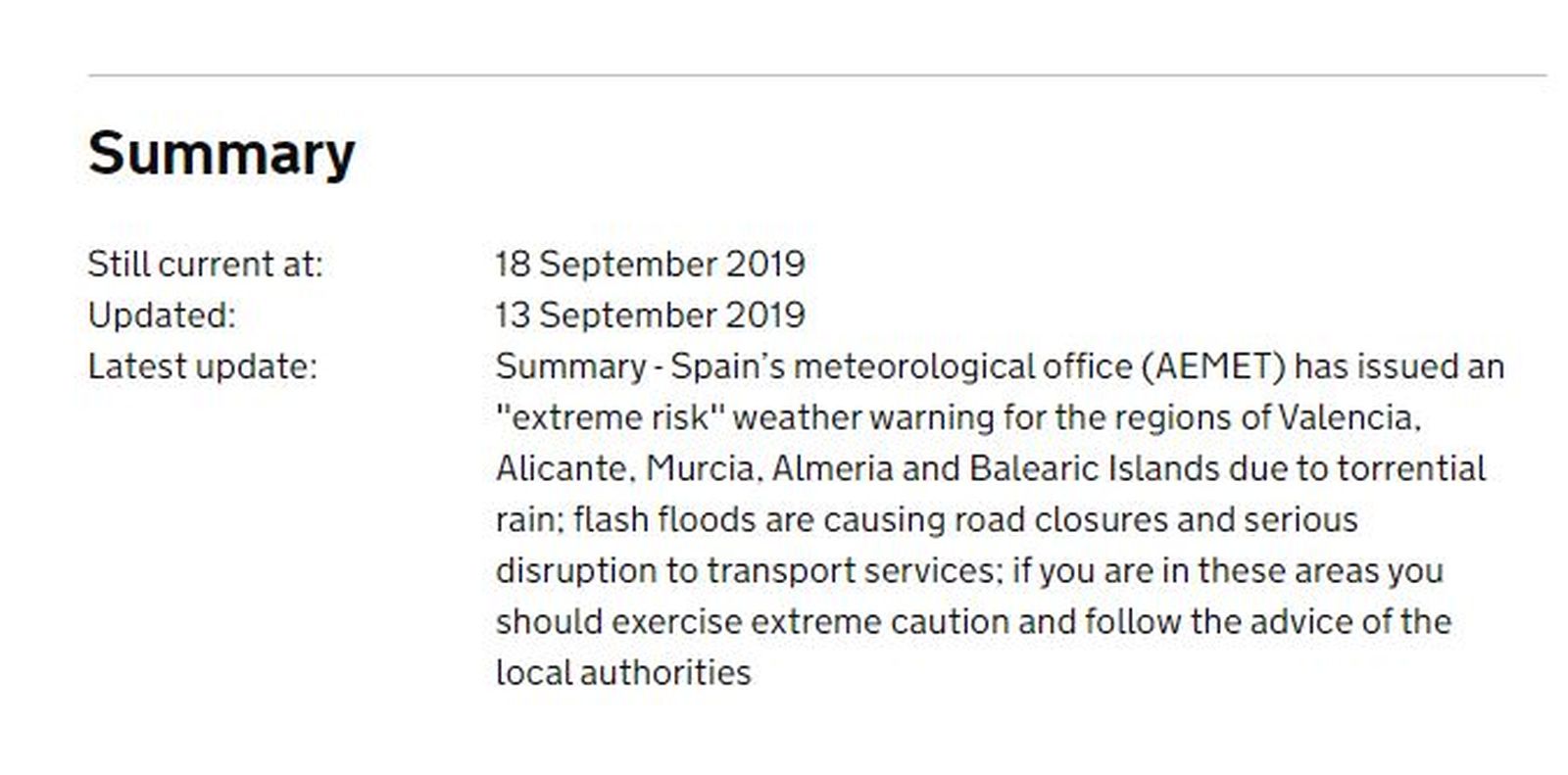 L'oficina adverteix els seus compatriotes de la devastació produïda per la gota freda a les comarques centrals i al Baix Segura .