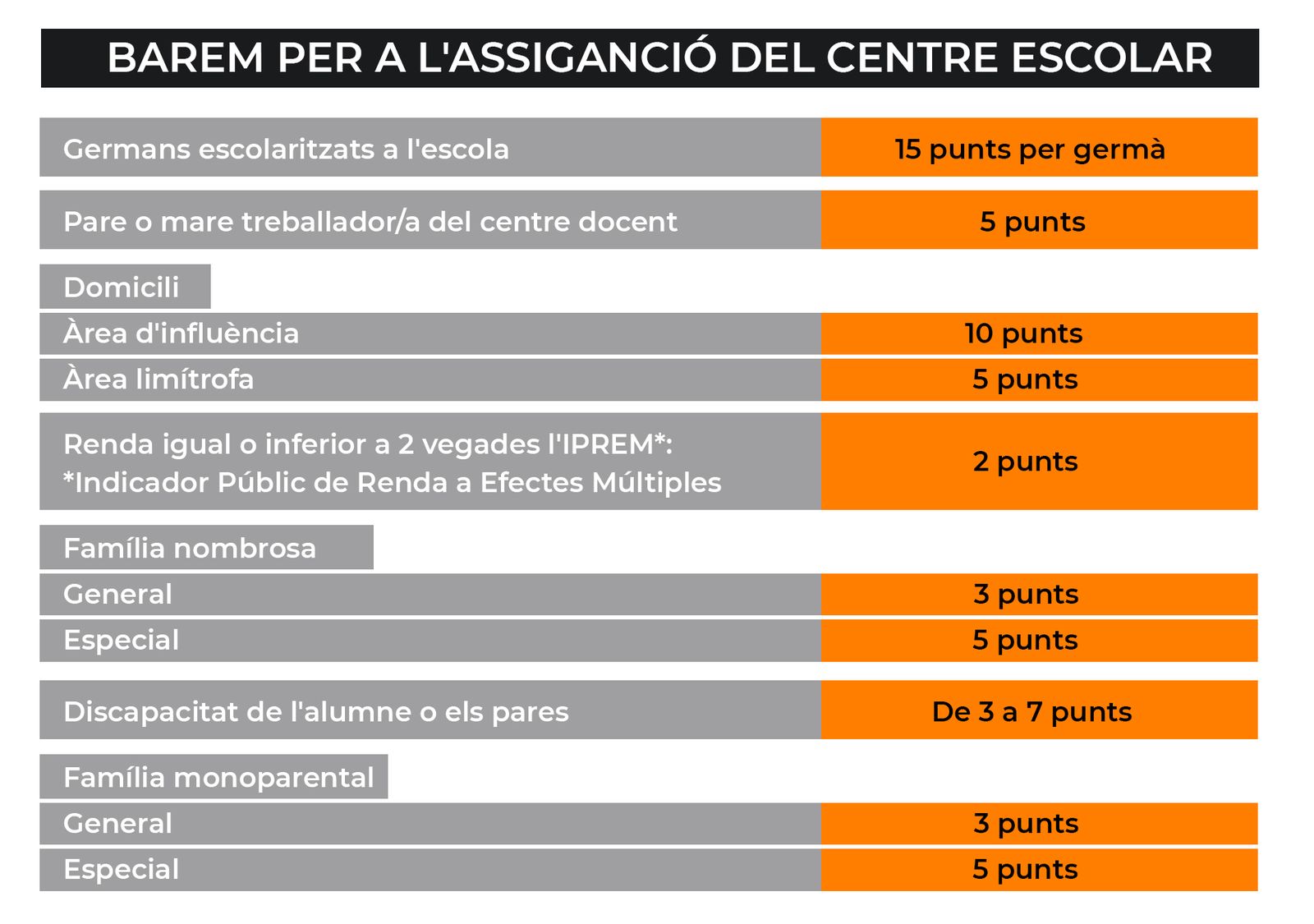 L'assignació del centre és el resultat del càlcul segons una sèrie de criteris objectius. El barem prioritza la presència d'altres germans en l'escola (15 punts per cadascun) i premia aspectes com la proximitat (10 punts per pertinença al districte escolar, 5 per als de l'àrea limítrofa), la condició de família nombrosa (fins a 7 punts), casos de discapacitat (fins a 7 punts), les famílies monoparentals (fins a 5 punts) o la renda (dos punts).