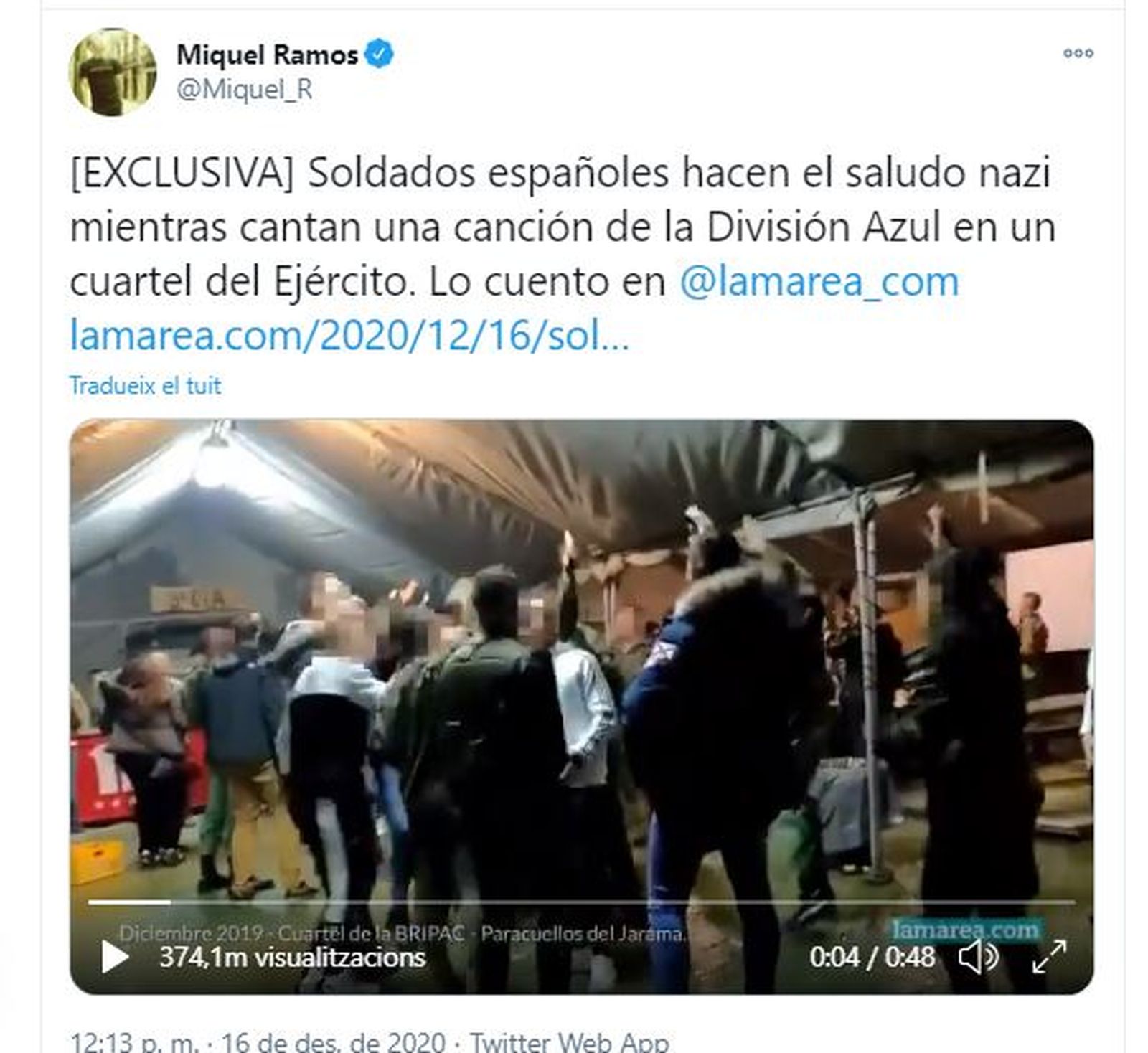 Després de conéixer el vídeo publicat per La Marea, el president del grup parlamentari d’Unides Podem al Congrés, Jaume Asens, ha reclamat la ministra de Defensa que expulse l’extrema dreta de les Forces Armades. Asens ha dit que l’apologia del nazisme no afecta únicament a militars retirats i que és “alarmant la infiltració de l’extrema dreta en l’exèrcit”.