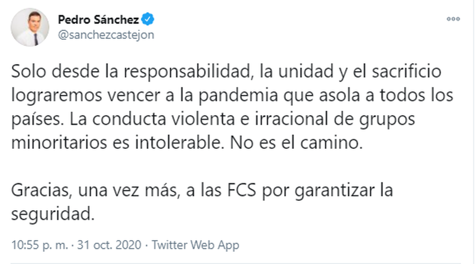 A través de les xarxes, el president del govern espanyol, Pedro Sánchez, ha condemnat la violència d'aquests grups i l'ha qualificada d'"intolerable" i "violenta i irracional". Sánchez ha recordat que només "des de la responsabilitat, la unitat i el sacrifici" s'aconseguirà véncer la pandèmia, i ha donat les gràcies les forces i cossos de seguretat per "garantir la seguretat" en els aldarulls.