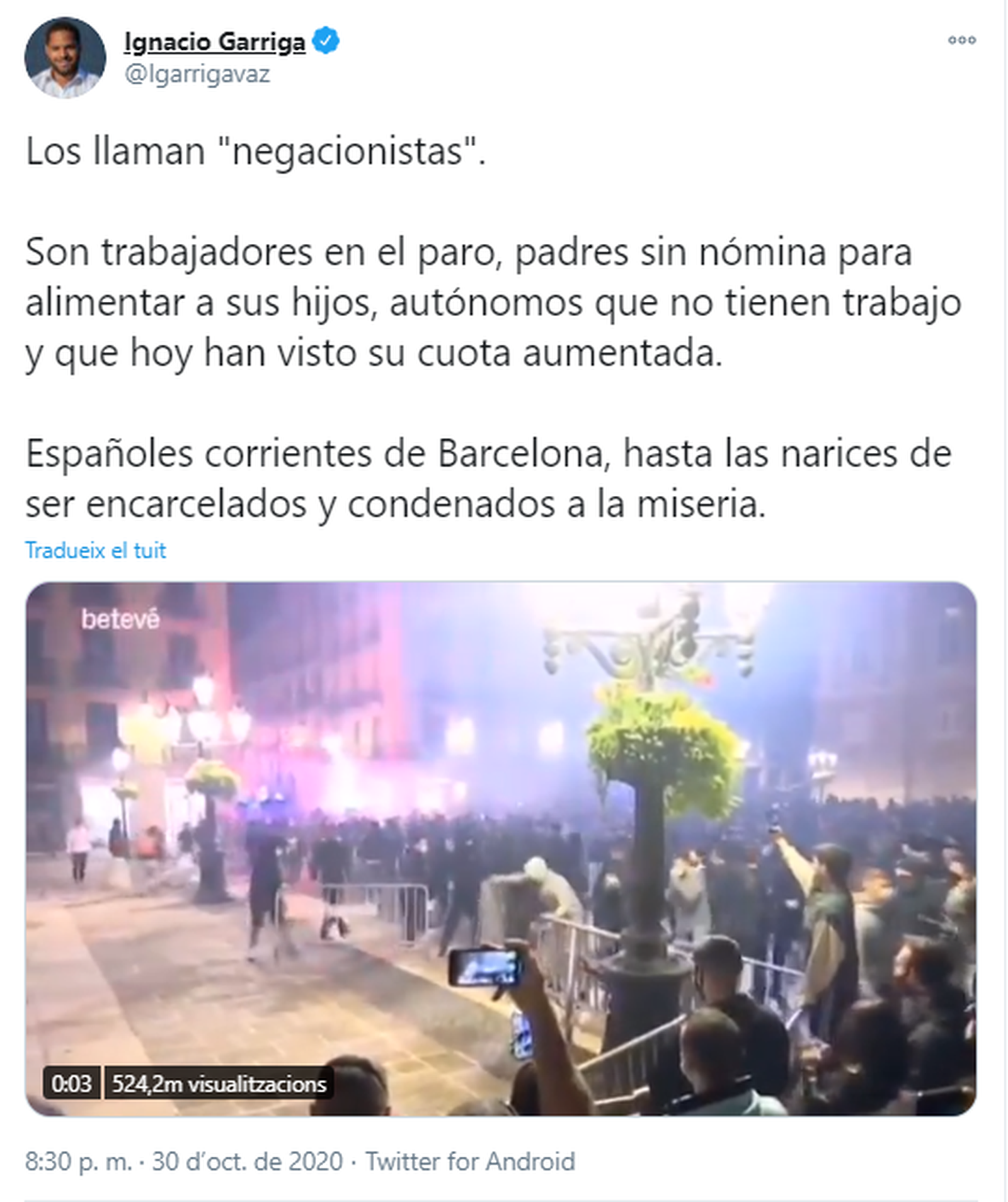 El partit que lidera Santiago Abascal, l'únic que ha votat en contra de l'estat d'alarma i considera el toc de queda inconstitucional, manté un doble discurs en les xarxes arran dels aldarulls. D'una banda, mostra tot el seu suport a les forces de seguretat. D'altra, difon missatges en què assegura que les manifestacions són pacífiques i els joves encaputxats que les protagonitzen, pares de família aturats.