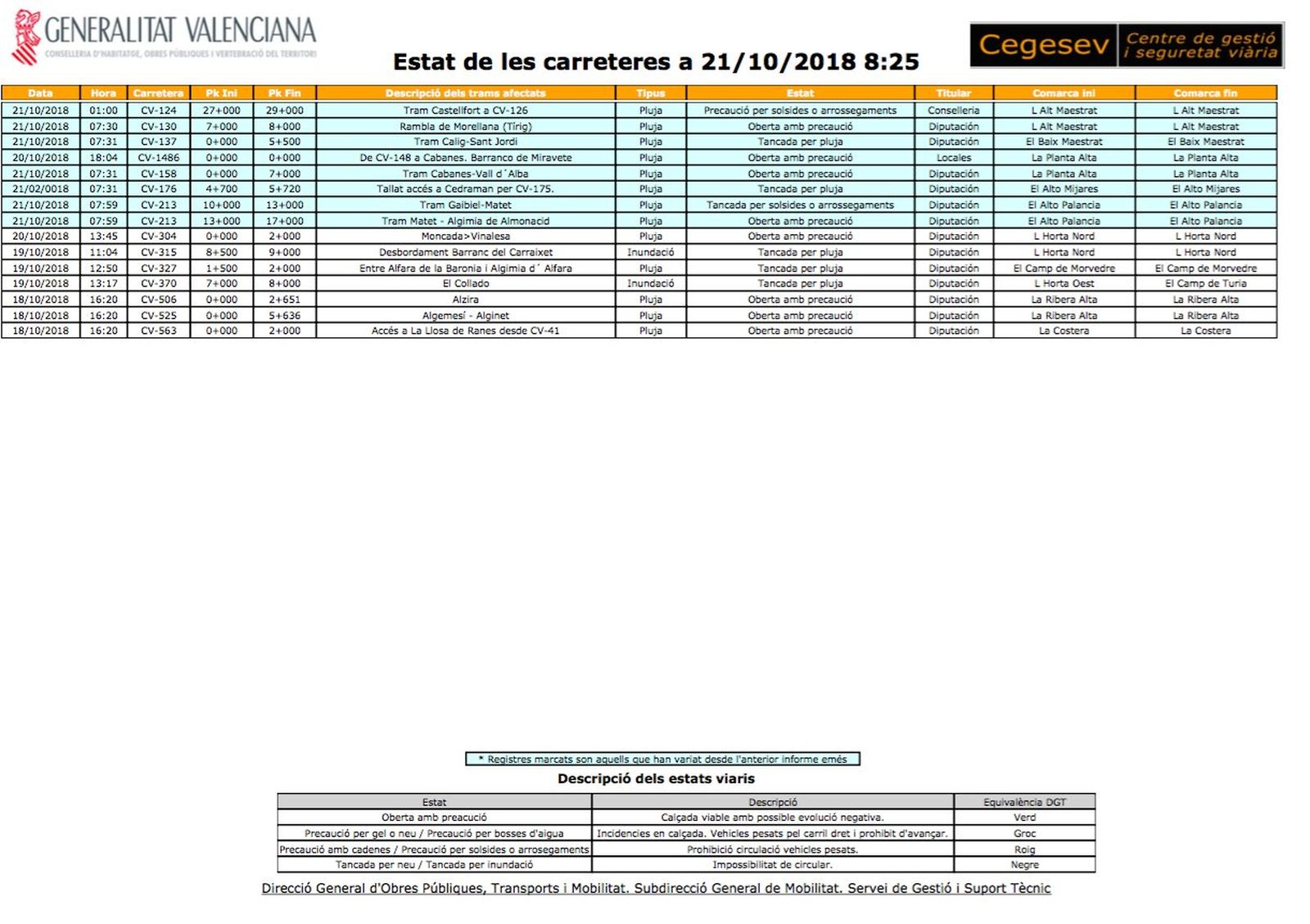 El 112 recomana circular amb precaució a les carreteres CV-124 (Castellfort, V126), CV-130 (rambla Morellana, Tírig), CV-1486 (de CV-148 a Cabanes), CV-158 (Cabanes-Vall d’Alba), CV-213 (Matet-Algímia), CV-304 (Montcada-Vinalesa), CV-506 (Alzira), CV-525 (Algemesí-Alginet) i CV-563 (Llosa de Ranes-CV-41).