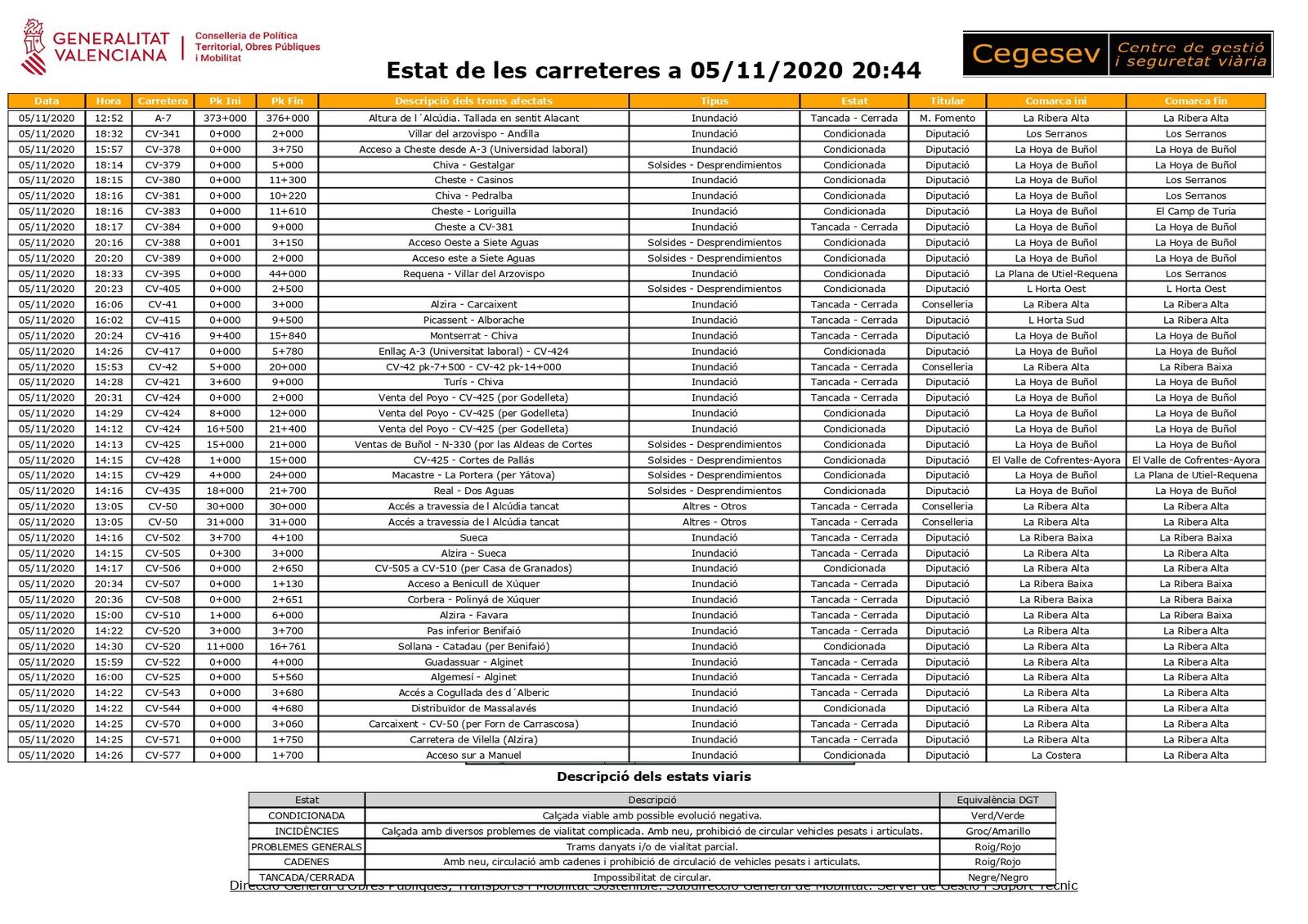 Les fortes precipitacions afecten a hores d’ara més de trenta carreteres, entre les quals està una de les principals artèries que travessen la Comunitat Valenciana. L'A-7 està tallada a l'altura de l’Alcúdia des d'aquest matí, segons informa la Direcció General de Trànsit. Pel que fa a les carreteres autonòmiques i comarcals, la Conselleria d'Obres Públiques ha informat en Twitter que n'hi ha 22 tallades per inundació i la circulació està condicionada per les solsides o els tolls d'aigua en altres 15 vies autonòmiques. La majoria d'aquestes carreteres es localitzen a la Ribera Alta i la Foia de Bunyol.