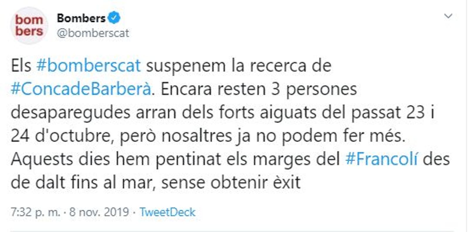 Els Bombers de la Generalitat de Catalunya han suspés definitivament la recerca dels tres desapareguts a Tarragona pel temporal de pluges del 23 i 24 d'octubre.