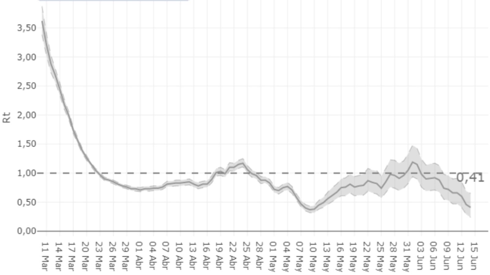 Segons les estimacions del Centre Nacional d'Epidemiologia (CNE), l'organisme oficial de referència a Espanya en l'estudi de l'evolució de l'epidèmia, que ha actualitzat per primera vegada les dades des de finals de maig, el nombre reproductiu bàsic del virus (Rt) se situa actualment en el 0,41.