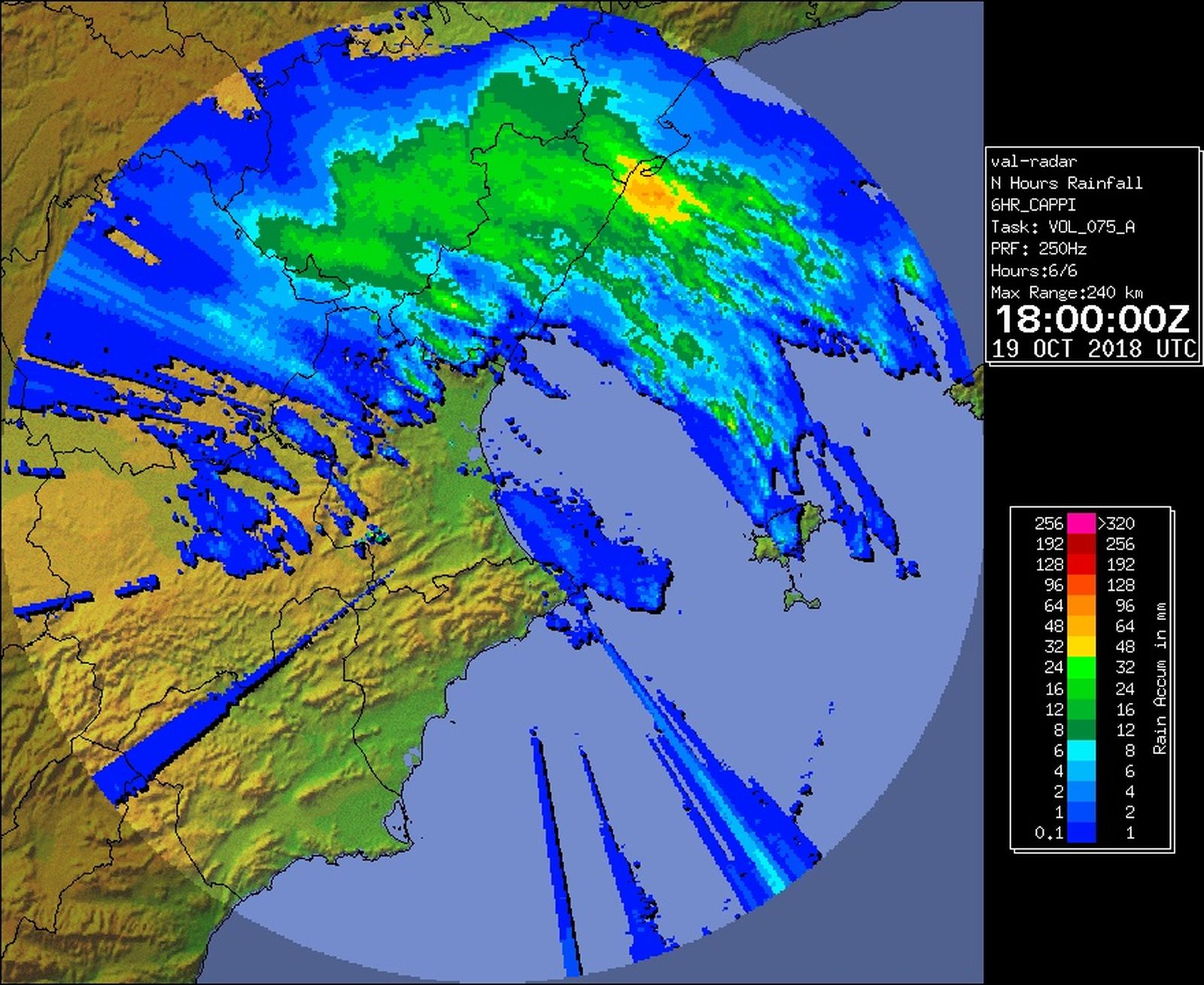 Des de les nou del matí de dijous fins a les nou de la nit de divendres, l'Agència Espanyola de Meteorologia (AEMET) ha registrat 375,6 l/m² a Vinaròs. Al llarg de la matinada de dissabte ha continuat plovent, i la xifra total es pot aproximar als 400 l/m². Es tracta d'una estimació i no d'una dada real, ja que l'estació va deixar de funcionar i caldrà veure sobre el terreny el que va passar a l'hora de validar aquestes xifres. Però amb l'ajuda del radar, que dona un màxim de reflectivitat justament a Vinaròs, podem considerar que es tracta d'un recull de pluja coherent.