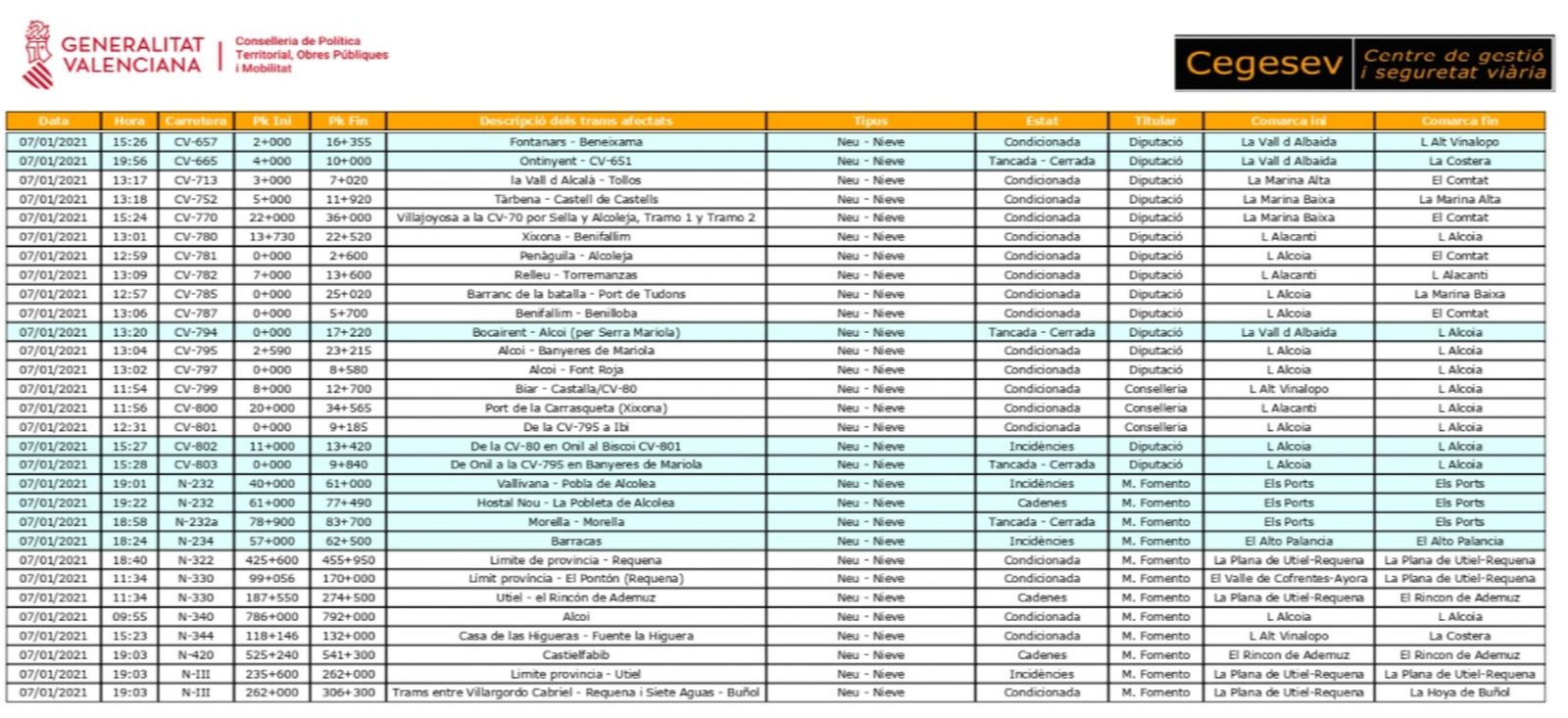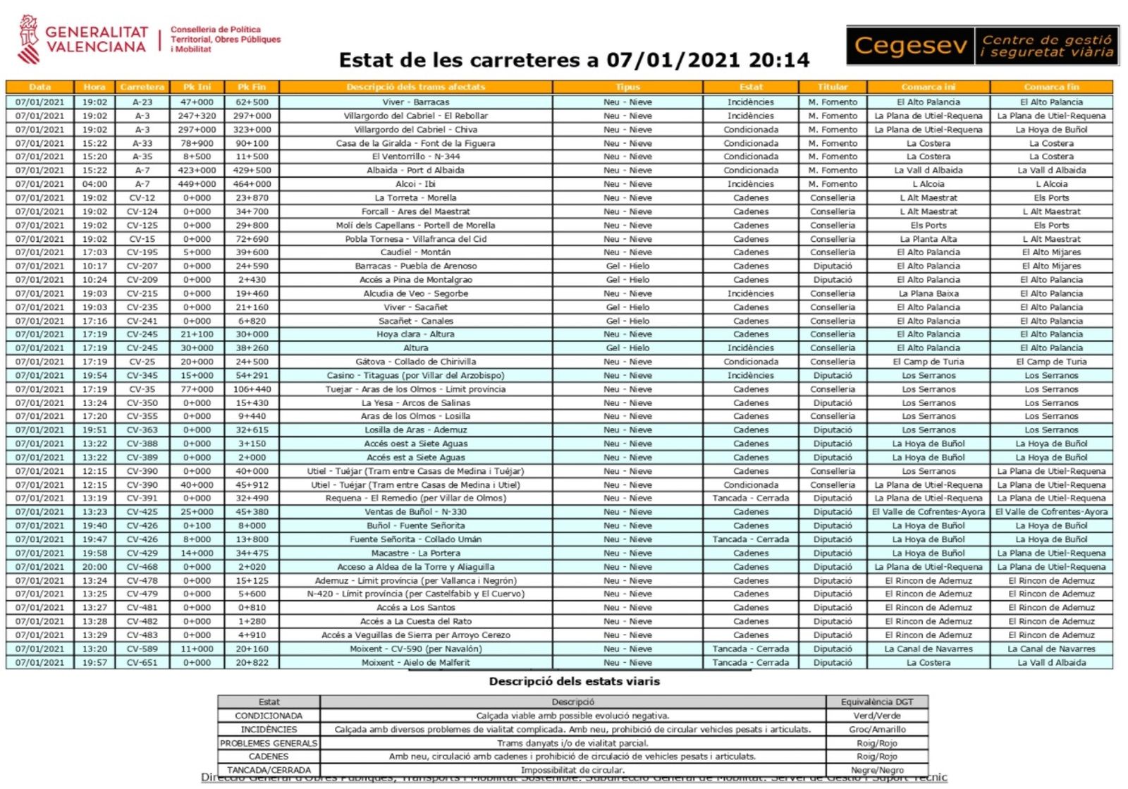 Durant tot el dia, les autoritats han estat tallant i obrint carreteres en funció de la situació de cada zona i, en altres recomanen també l'ús de cadenes. Aquesta és la situació en l'última actualització del servei d'emergències 112.