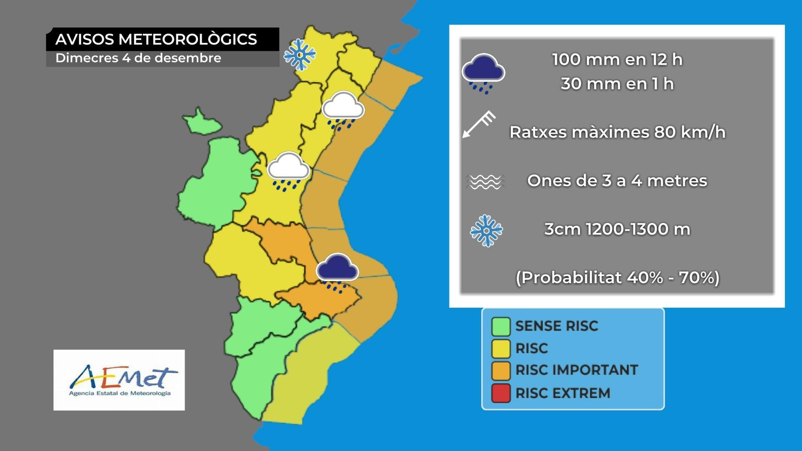 L'Agència Estatal de Meteorologia (Aemet) manté l'avís taronja a pràcticament tot el litoral de la Comunitat Valenciana per temporal marítim, ja que el vent pot arribar a bufar amb ratxes de més 80 quilòmeres per hora. Al terme de Borriol, a la Plana Alta, ja han superat els 100. També s’ha activat l'avís taronja a les comarques del sud de València i del nord d'Alacant en previsió de pluges que podrien acumular més de 100 l/m² en 12 hores. Al nord de València i a les comarques del nord l'avís és groc.
