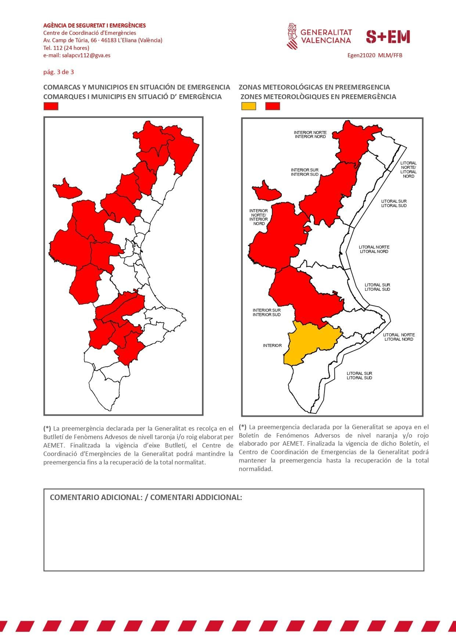 El Centre de Coordinació d’Emergències de la Generalitat manté la situació zero aquest dissabte a l'Alt Maestrat, l'Alcalatén, l'Alt Millars, la Foia de Bunyol, l’interior de l’Alacantí i la Vall d’Albaida, els Ports, el Baix Maestrat, l’Alt Palància, la Plana d'Utiel-Requena, els Serrans, el Racó d'Ademús, la Vall d'Aiora-Cofrents, la Costera, l'Alcoià i l'Alt Vinalopó.