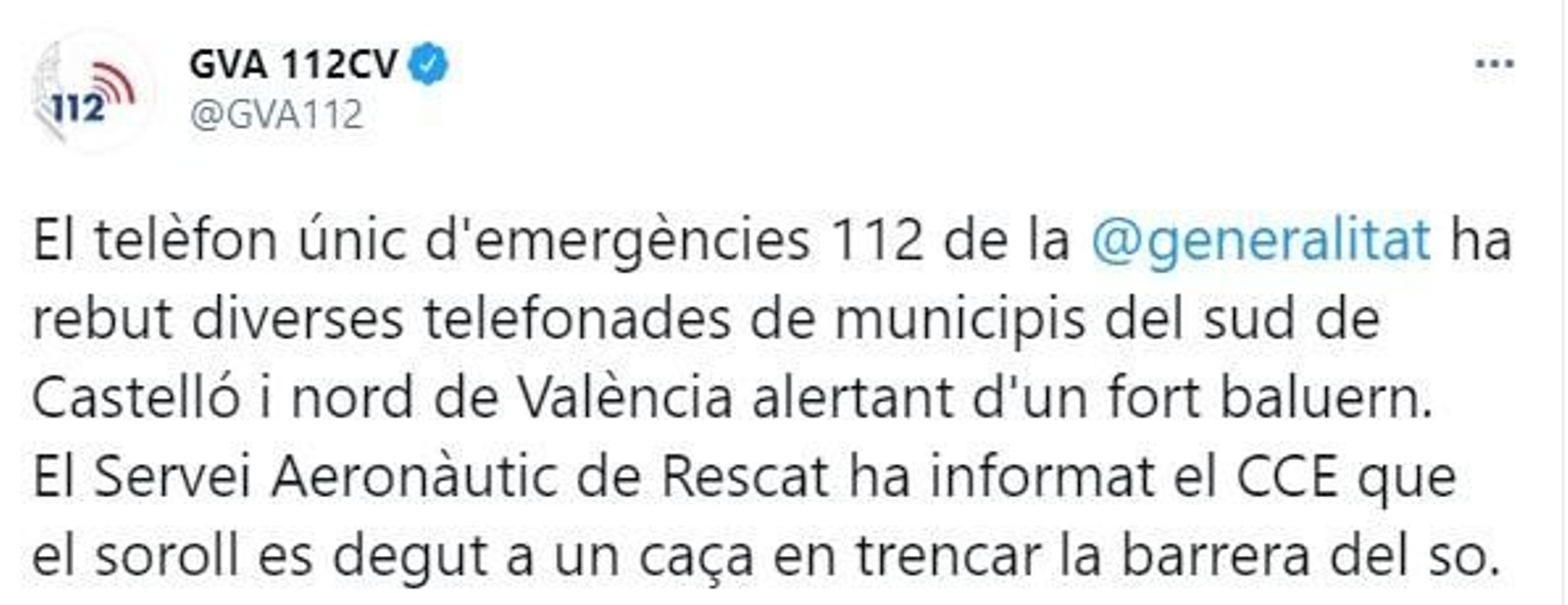 Minuts després, el Servei d'Emergències del 112 ha confirmat a través de les xarxes que el Servei Aeronàutic de Rescat ha confirmat al Centre de Coordinació d'Emergències que el soroll s'ha degut a un caça que ha trencat la barrera del so en diverses ocasions.