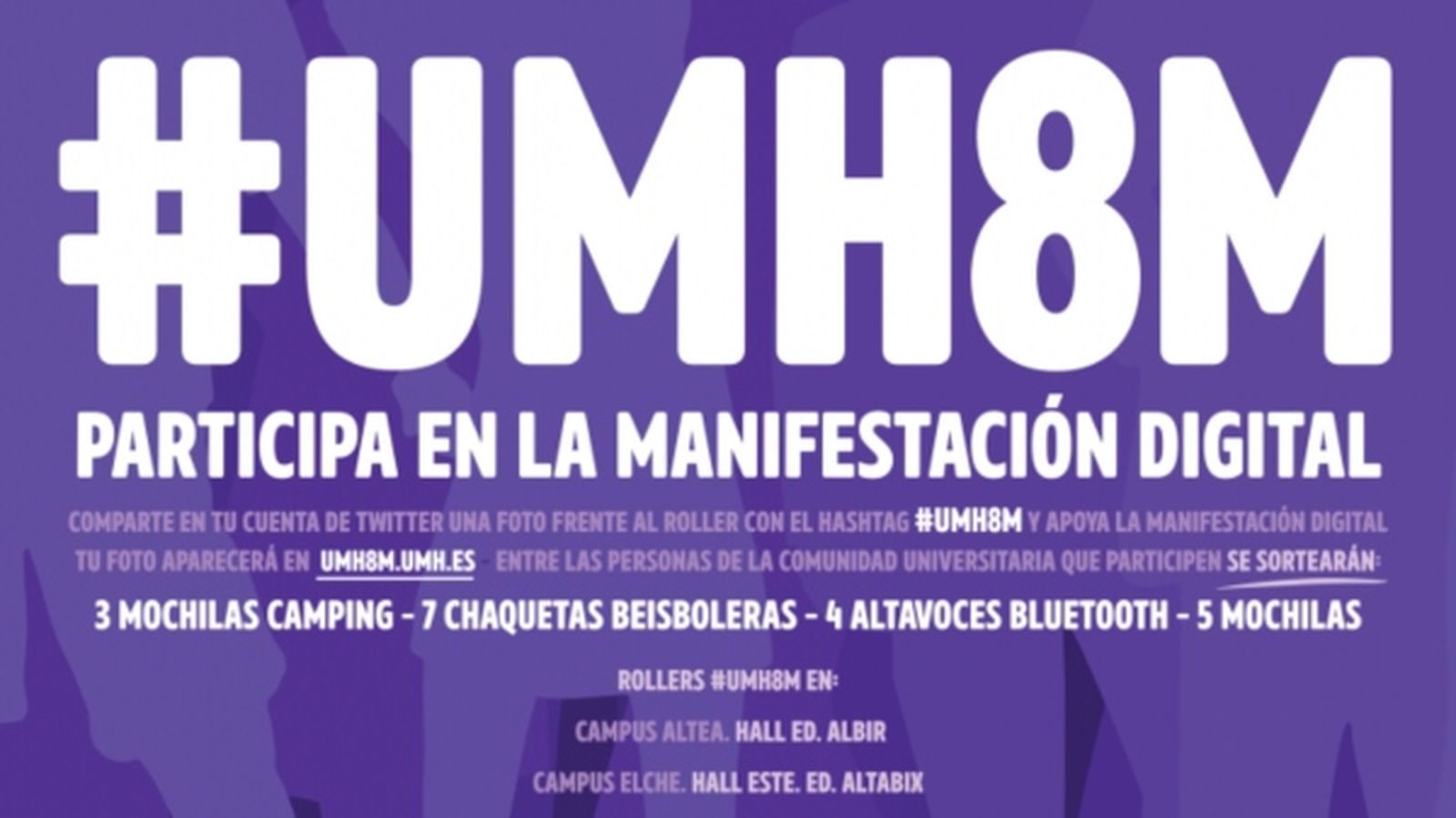 La Unitat d’Igualtat de la Universitat Miguel Hernández d’Elx ha convocat una manifestació virtual per a mostrar el seu suport a les dones en aquest dia. La institució acadèmica ha instal·lat un roller on les persones que així ho desitgen poden fer-se una foto i compartir-la en els seus comptes e Twitter amb l’etiqueta #UMH8M. Una convocatòria que està oberta des d’aquest dimarts i que finalitzarà el pròxim dilluns 11.