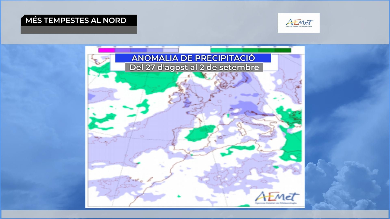 No hi ha cap dubte que estem vivint un estiu tempestuós, fet que pot tindre continuïtat la setmana que ve, però no a tot arreu. Tal com s'observa en el mapa següent, les taques verdes indiquen pluges superiors a les habituals durant la pròxima setmana a les comarques interiors de Castelló, segurament per la persistència de les tempestes. Però encara estem lluny d'una situació de pluges generals i generoses que faça saó i ajude a recarregar els aqüífers.