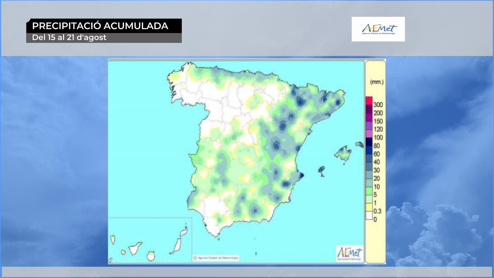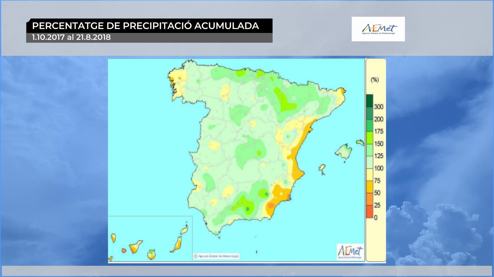 Aquestes tempestes d'estiu han ajudat a maquillar la falta de pluges. Però, si ho mirem amb perspectiva, veiem que mentre en gran part de la península ha plogut més del normal, en pràcticament tot el litoral mediterrani les pluges estan entre el 50% i el 75% del que tocaria des del passat 1 d'octubre. A la Comunitat, les precipitacions només estan per damunt del normal a les comarques interiors del sud de València i del nord d'Alacant, i en una estreta franja de l'interior de Castelló.