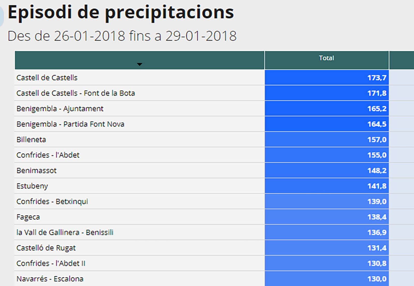 Les dades de pluja acumulades passaren de 100 l/m2 en diversos observatoris del sud de la Ribera, la Canal de Navarrés, la Safor, la Marina, la Costera, la Vall d'Albaida i l'Alcoià. I destacaren els més de 50 l/m² registrats a les comarques del sud, a l'Alacantí, el Vinalopó i el Baix Segura, molt perjudicades per la perllongada sequera dels mesos precedents.