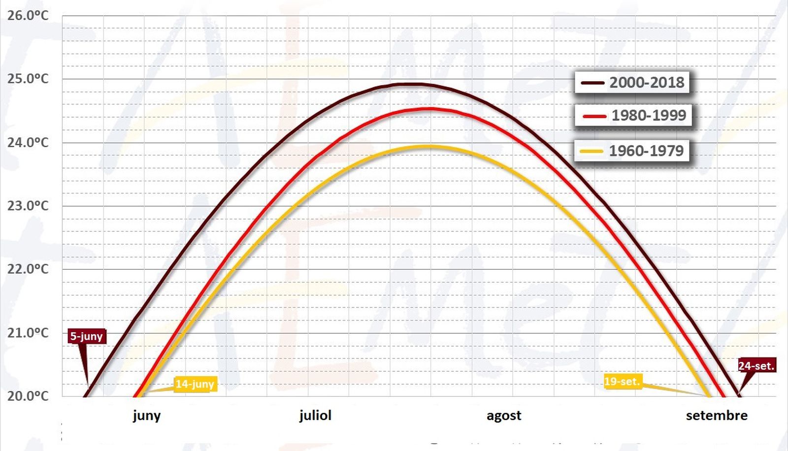 A la Comunitat València, podem vore com primer a l'estiu s'ha observat un augment de la temperatura mitjana i, les últimes dècades un augment de la mitjana i, sobretot, de l'inici de les temperatures que podem considerar com a estiu.
