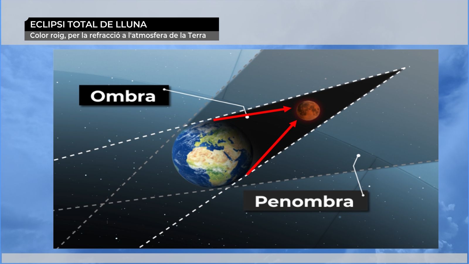 En el moment de l'eclipsi total, quan la Lluna se situa en la zona d'ombra, no estarà totalment a fosques. Com que la Terra té atmosfera, part de la radiació solar es refracta, es desvia, de manera que il·lumina la superfície de la Lluna. Les longituds d'ona corresponent als colors taronja i roig es desvien més i, donen la tonalitat rogenca. És per això que moltes persones anomenen aquesta lluna, lluna de sang.
