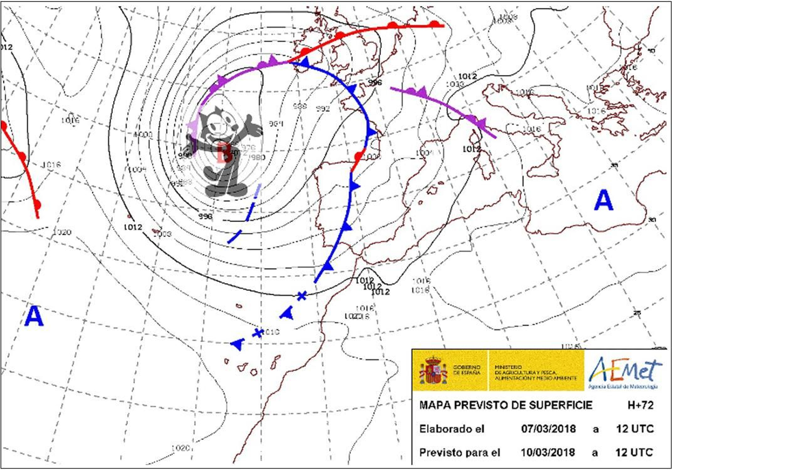 Mapa de superfície previst per al dissabte dia 10, amb la situació de la borrasca Felix (identificada amb la imatge de Fèlix el gat)