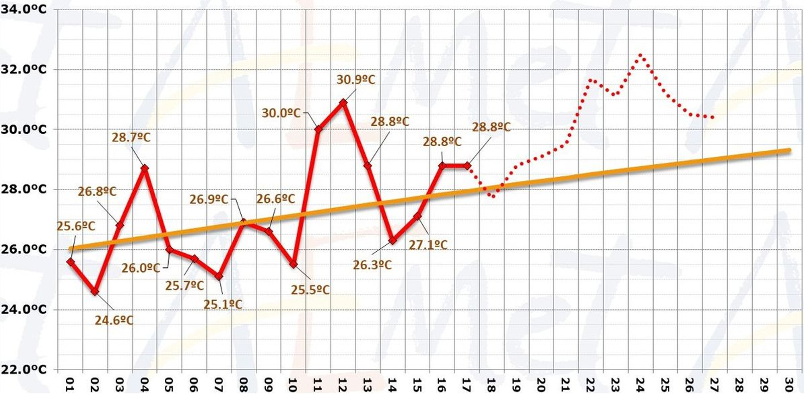 Les Fogueres es presenten especialment càlides enguany. Des del dia 20 fins al dia de la Cremà, 24 de juny, s'esperen nits tropicals, amb temperatures mínimes que no baixaran dels 20 °C. Les màximes també seran bastant altes a Alacant. Es preveuen uns 29 °C dimecres i dijous, però divendres les temperatures pujaran més encara, de manera que el cap de setmana arribaran a 30-31 °C. Les probabilitats de pluja seran nul·les al llarg de tota la setmana i el vent, en general de component est, bufarà molt fluix.