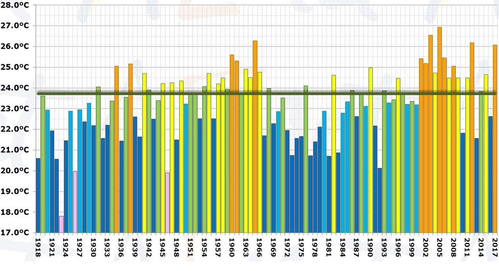Les Fogueres del 2017 foren molt càlides. Amb una temperatura mitjana de vora 26 graus, van ser les quintes més caloroses del registre dels últims 100 anys, només darrere dels anys 2012, 2005, 2003 i 1965.
