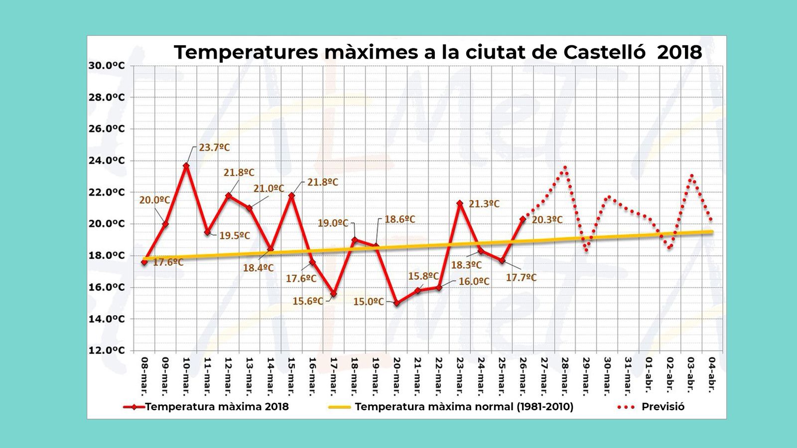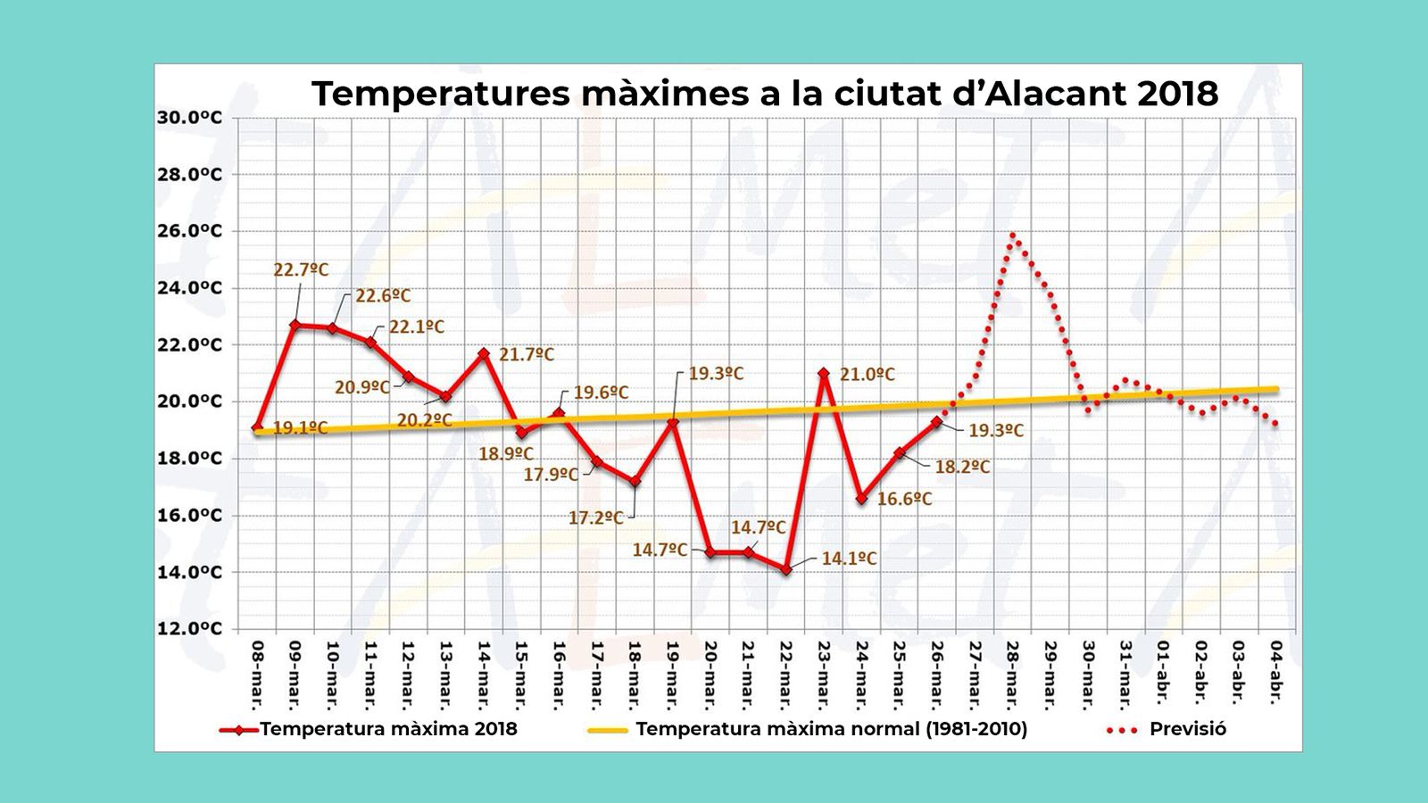 Sembla que la primavera ha arribat per a quedar-se. Almenys, així serà durant els pròxims dies. Aquesta setmana les temperatures màximes seran prou elevades en gran part de la Comunitat. A les tres capitals de província, el mercuri superarà de bon tros els 20°. El dia 27 l'ascens tèrmic ha sigut considerable, però el dia 28 a Castelló fregaran els 24°, a Alacant els 26° i a València fins i tot els 28°.