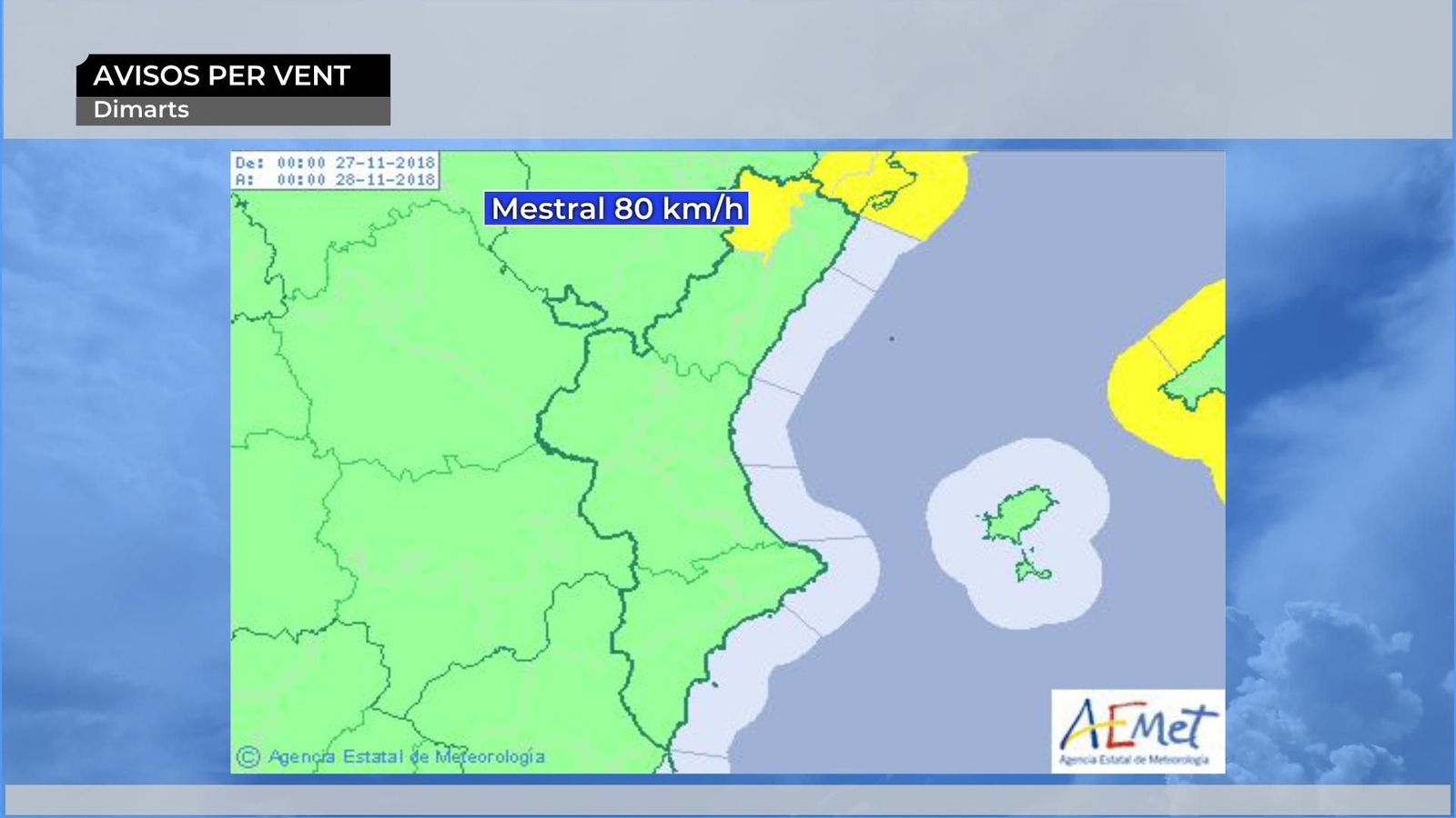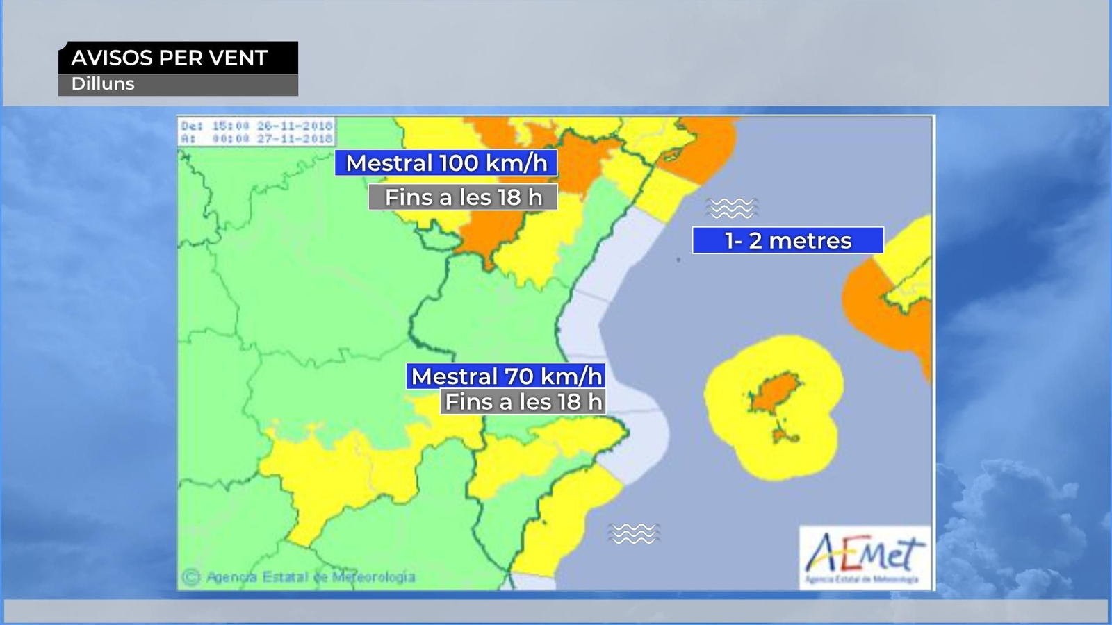 Es preveuen intervals de vent fort i, fins i tot, ratxes màximes molt fortes. Cap a l'interior nord es poden superar els 90-100 km/h. A més, pràcticament tot el litoral està en avís groc per vent costaner, taronja en el cas del nord d'Alacant, on es preveuen ones de fins 2,5 metres d'altura.