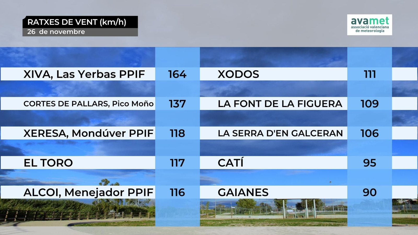 Durant les últimes hores ja s'han registrat ratxes de vent màximes superiors als 100 km/h als cims de les nostres muntanyes. Destaquen els 164 km/h a Xiva o els 137 km/h a Cortes de Pallars. D'altra banda, també s'han registrat ratxes de vent molt fortes en observatoris situats en els centres urbans de localitats com ara El Toro, on han arribat als 117 km/h o a Xodos, amb 111 km/h.