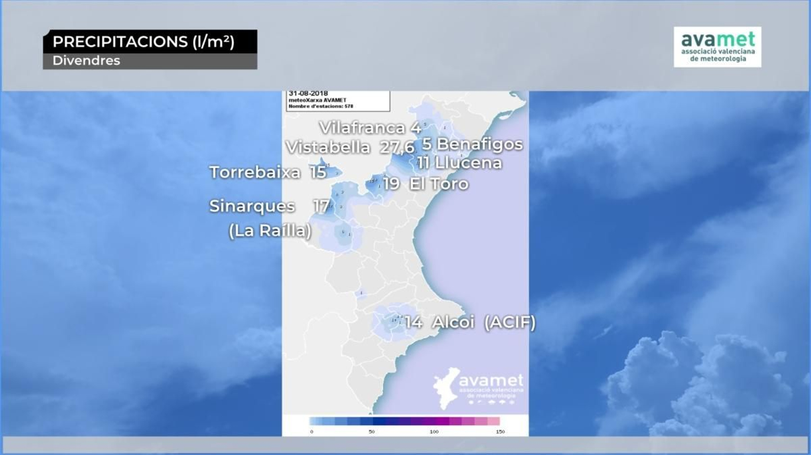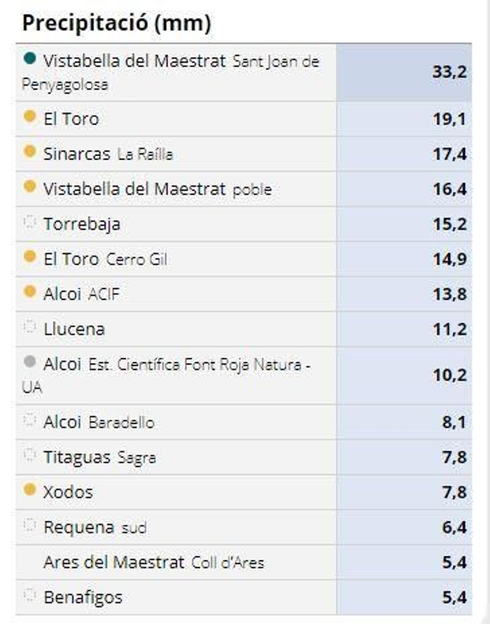 Les quantitats acumulades han superat els 30 l/m² a Sant Joan de Penyagolosa, a Vistabella del Maestrat, on hi ha l’estació meteorològica de l’Associació Valenciana de Meteorologia (Avamet).