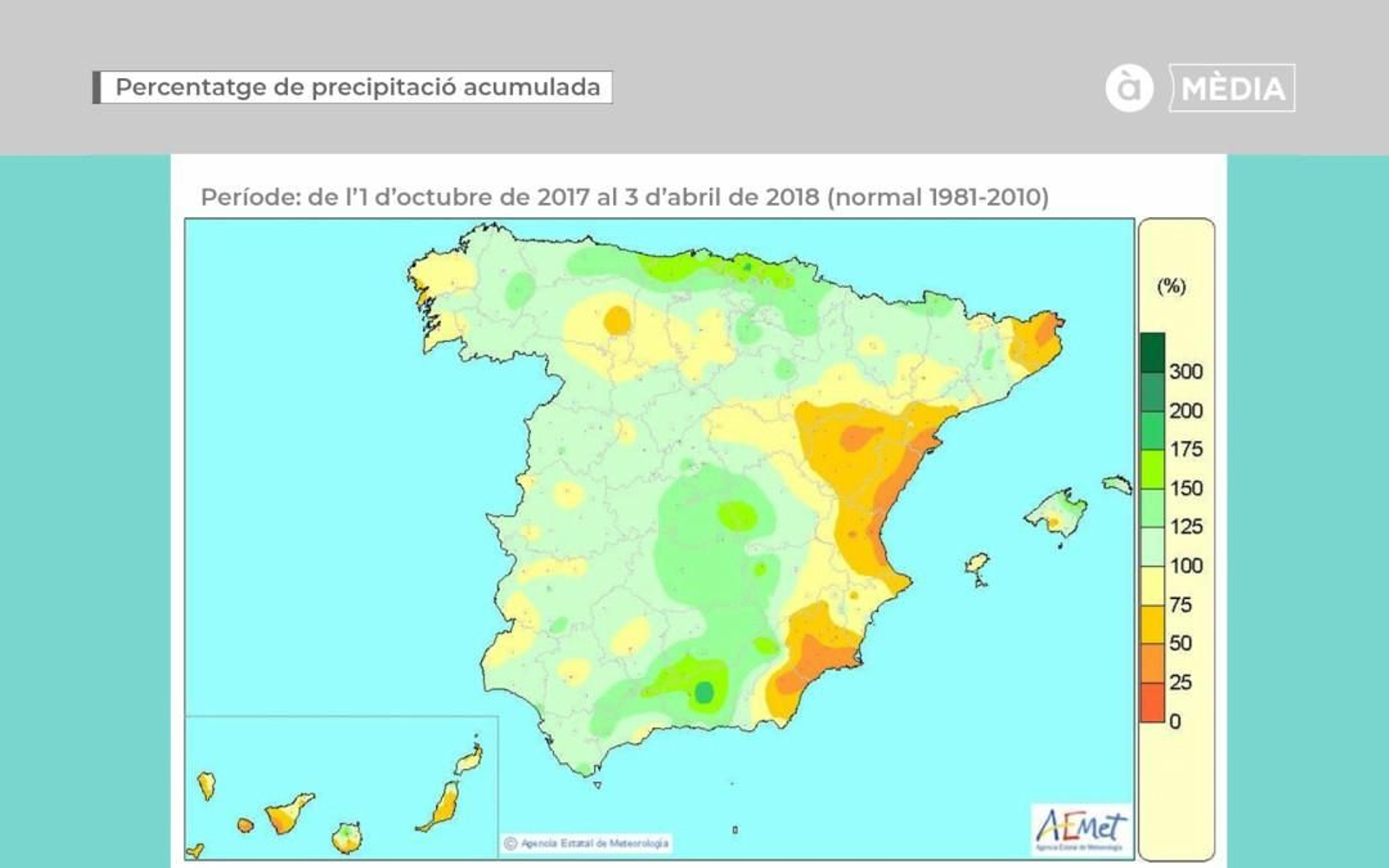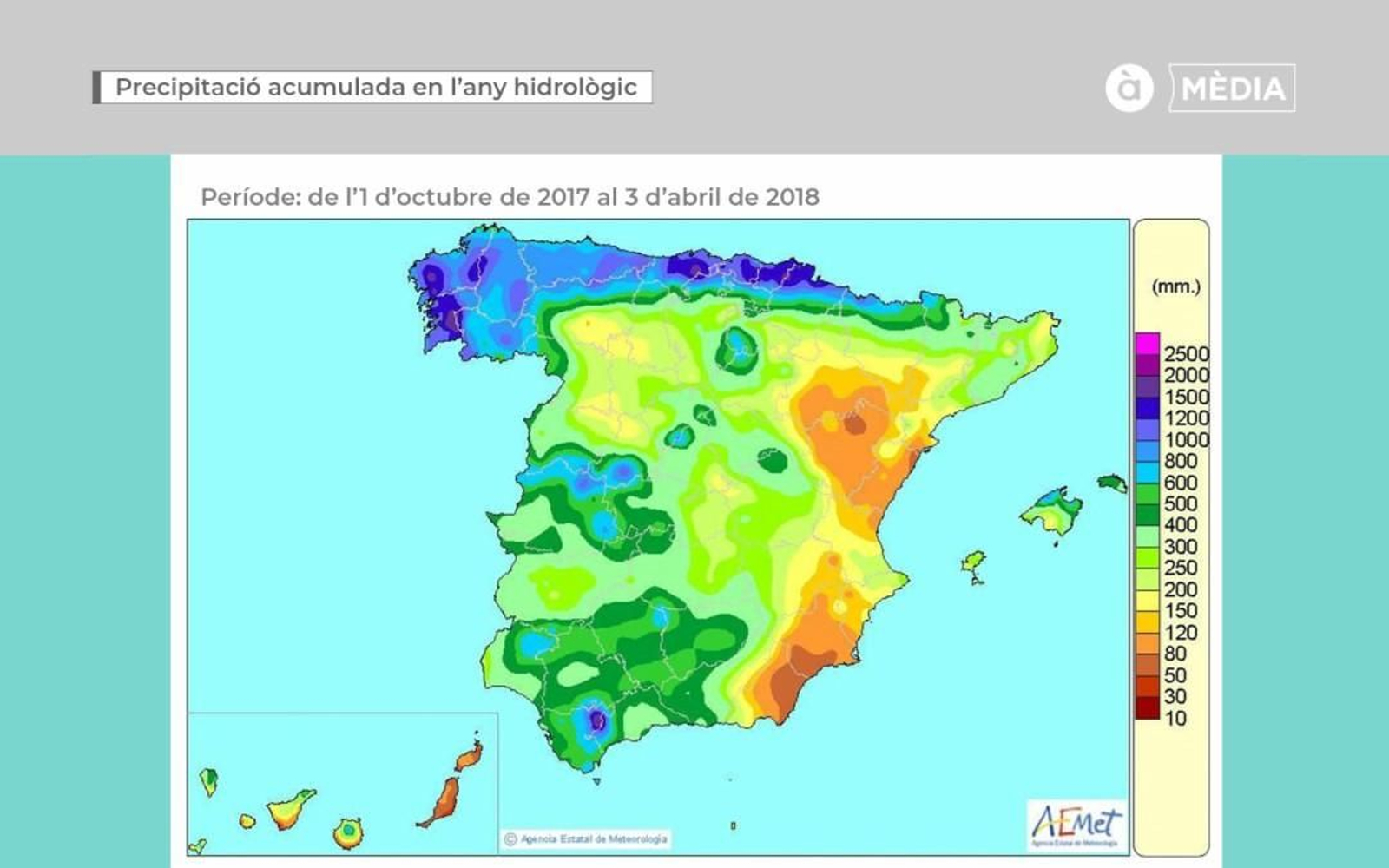 La mitjana espanyola de precipitacions acumulades des que va començar l'any hidrològic, l'1 d'octubre de 2017, és de 441 mm, dada que supera en un 8% la xifra normal, establits amb els valors mitjans des del 1981 al 2010, que correspon a aquest període.