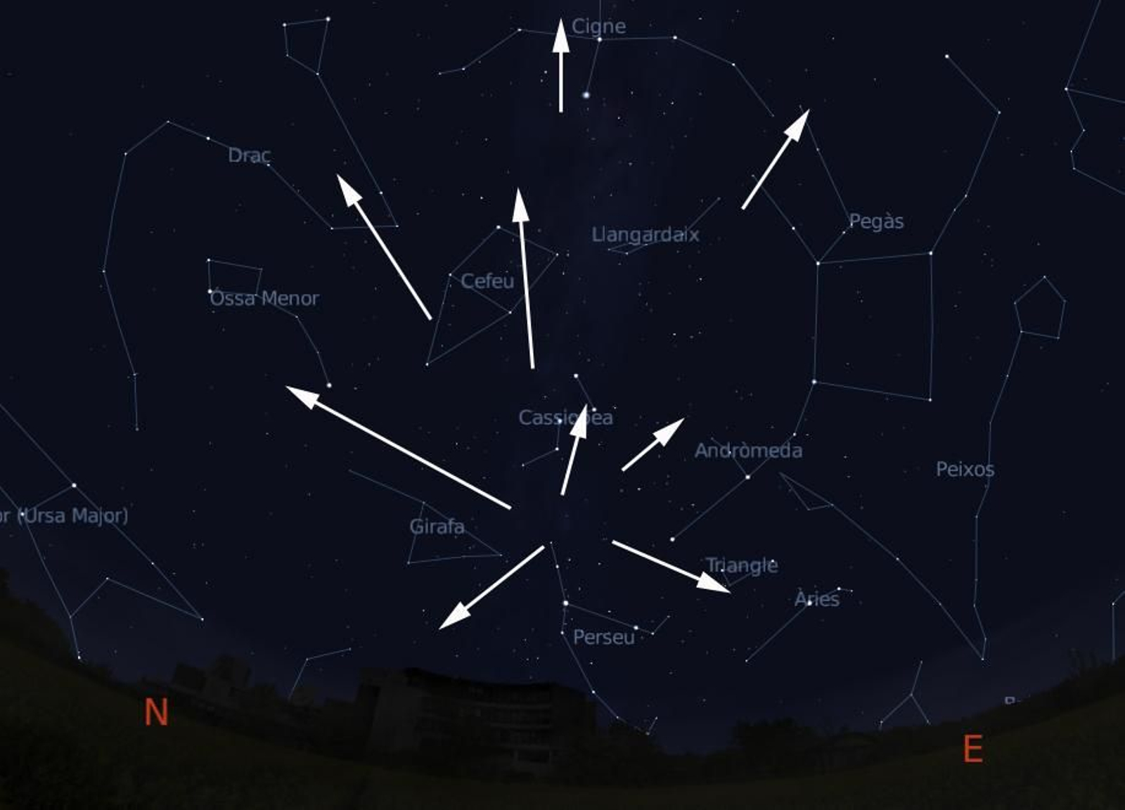 Encara que es poden veure meteors en qualsevol zona del cel, la millor orientació és mirar cap al nord-est, en direcció a les constel·lacions de Perseu i Cassiopea. De fet, el nom de Perseids té l'origen en el fet que tots pareixen entrar a l'atmosfera per una zona del cel, que anomenem radiant, i que està a la constel·lació de Perseu.
