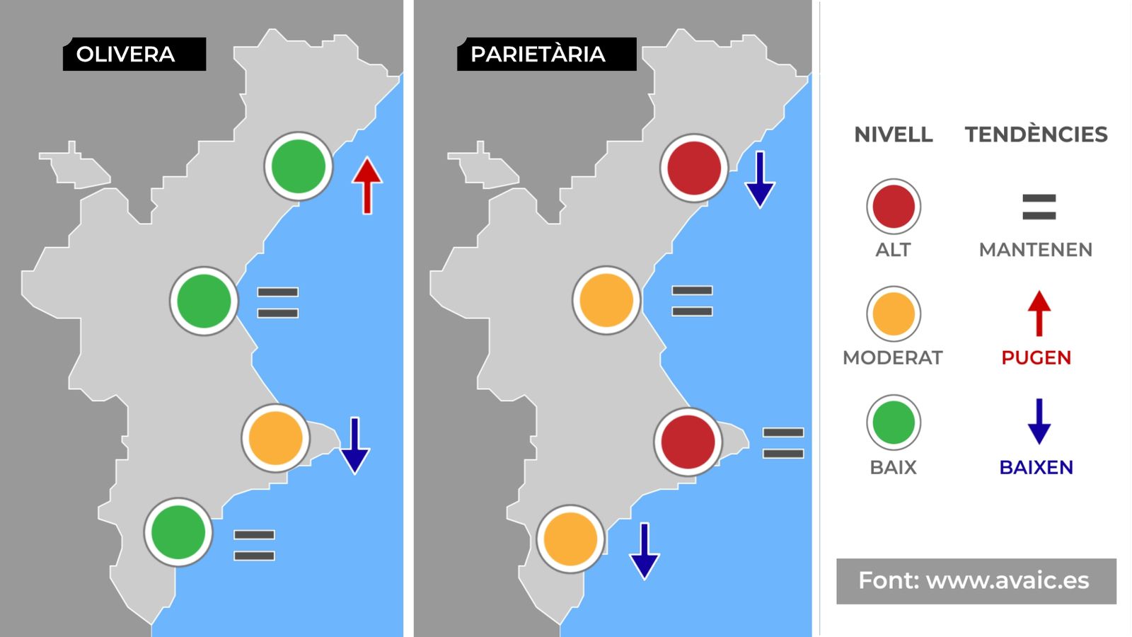 Les parietàries és una altra espècie que també s'ha vist molt afavorida per les condicions meteorològiques, primer d'humitat i després de sol i calor. Els valors han augmentat per tot el territori, fins i tot a Alacant, encara que a les zones més seques disminuirà els pròxims dies. En zones humides, com ara la Marina Alta, s'han registrat nivells molt elevats, que encara que disminuiran els pròxims dies, es mantindran dins de la categoria de nivell alt. TIndrà una presència destacable a tot el territori.